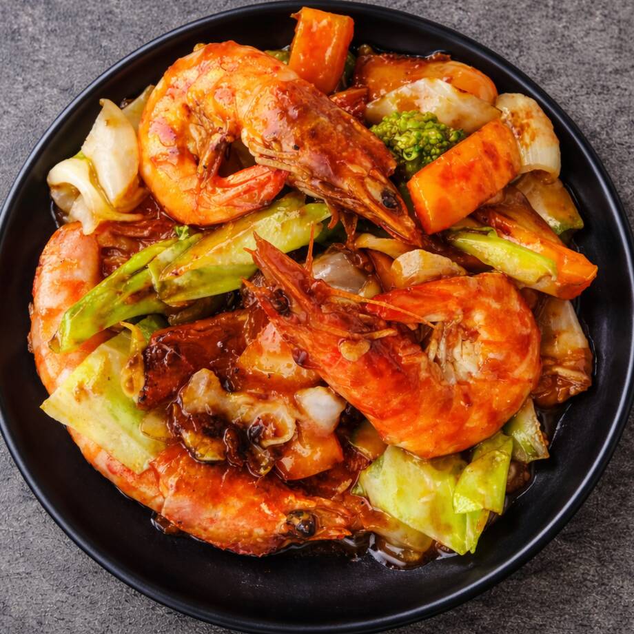 Camarones salteados con vegetales en salsa de soya