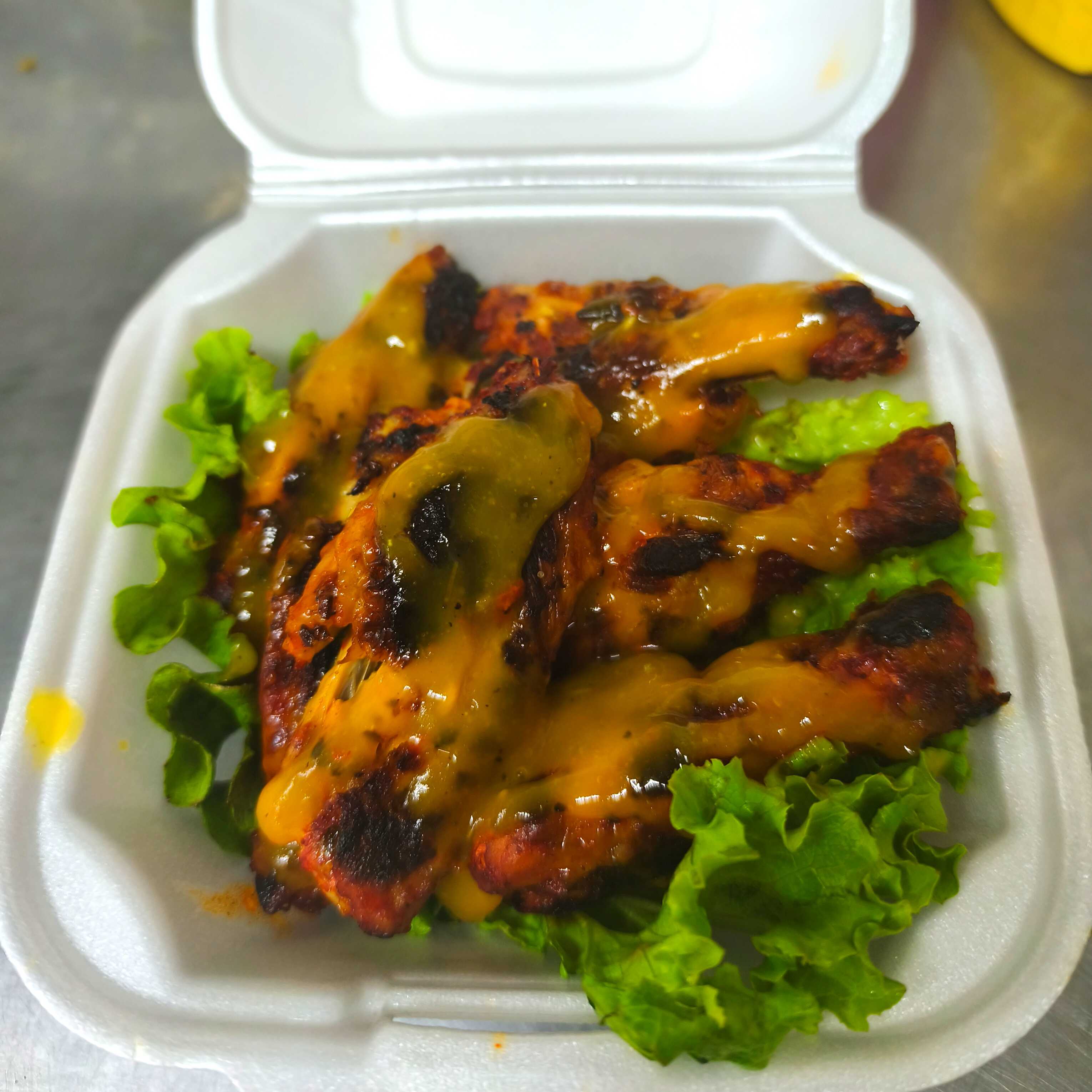 ALITAS ADOBADAS BAÑADAS EN SALSA MANGO-HABANERO RESETA DE LA CASA ACOMPAÑADAS CON LECHUGA ITALIANA ,COCCION SIN ACEITES
