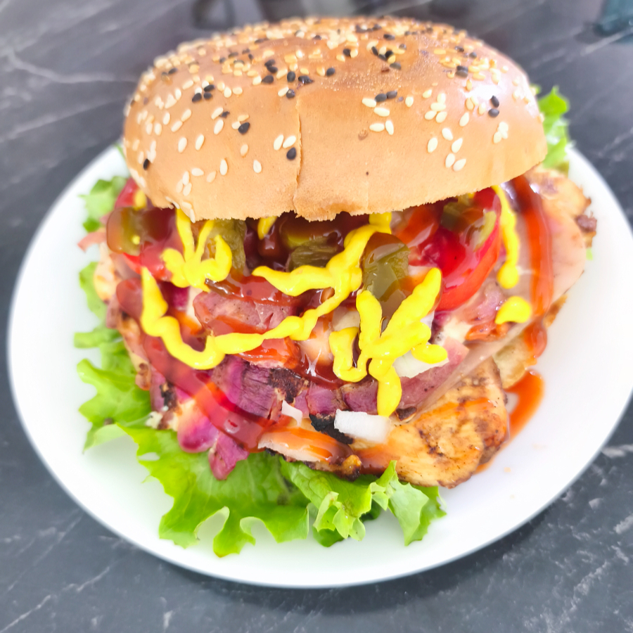 Filete de pollo, manchego, jamón, lechuga, jitomate, cebolla, picante,catsup, mayonesa, mostaza