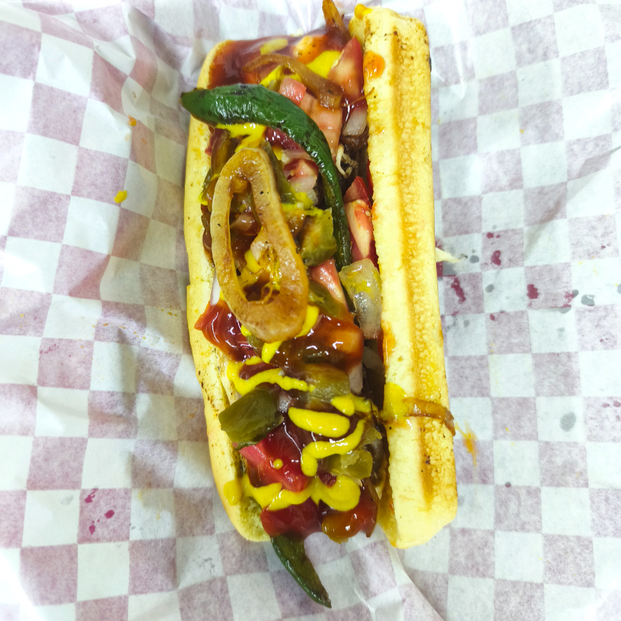 Salchicha , jitomate, cebolla, picante,captsu,mayonesa,mostaza
