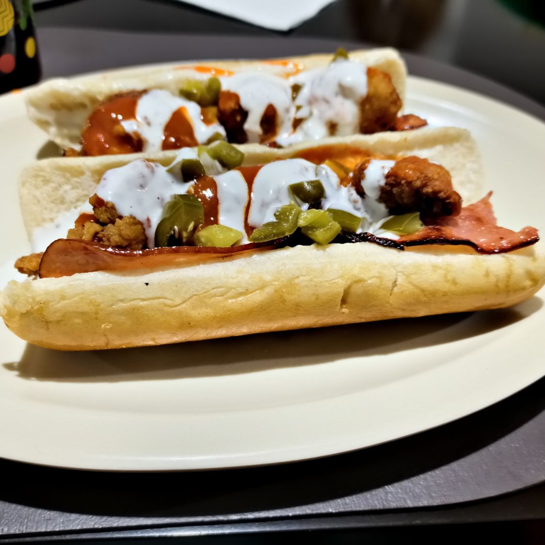 Hocho con una rica y frita salchicha ,bañado en la salsa de tu agrado