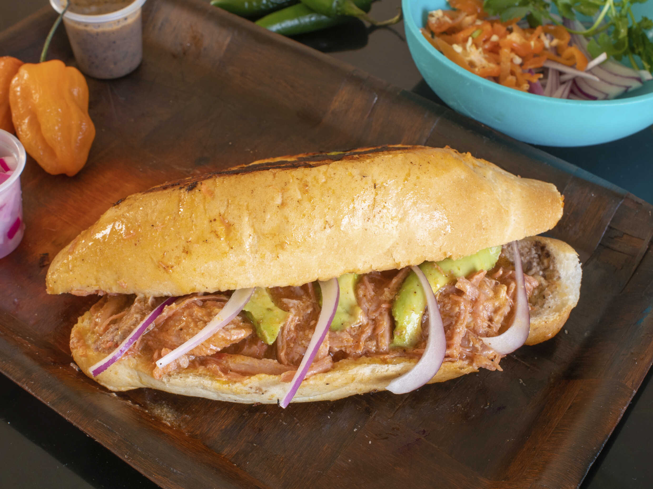 Bolillo calientito, frijoles, mayonesa, cebolla morada y salsa Xnipec.
