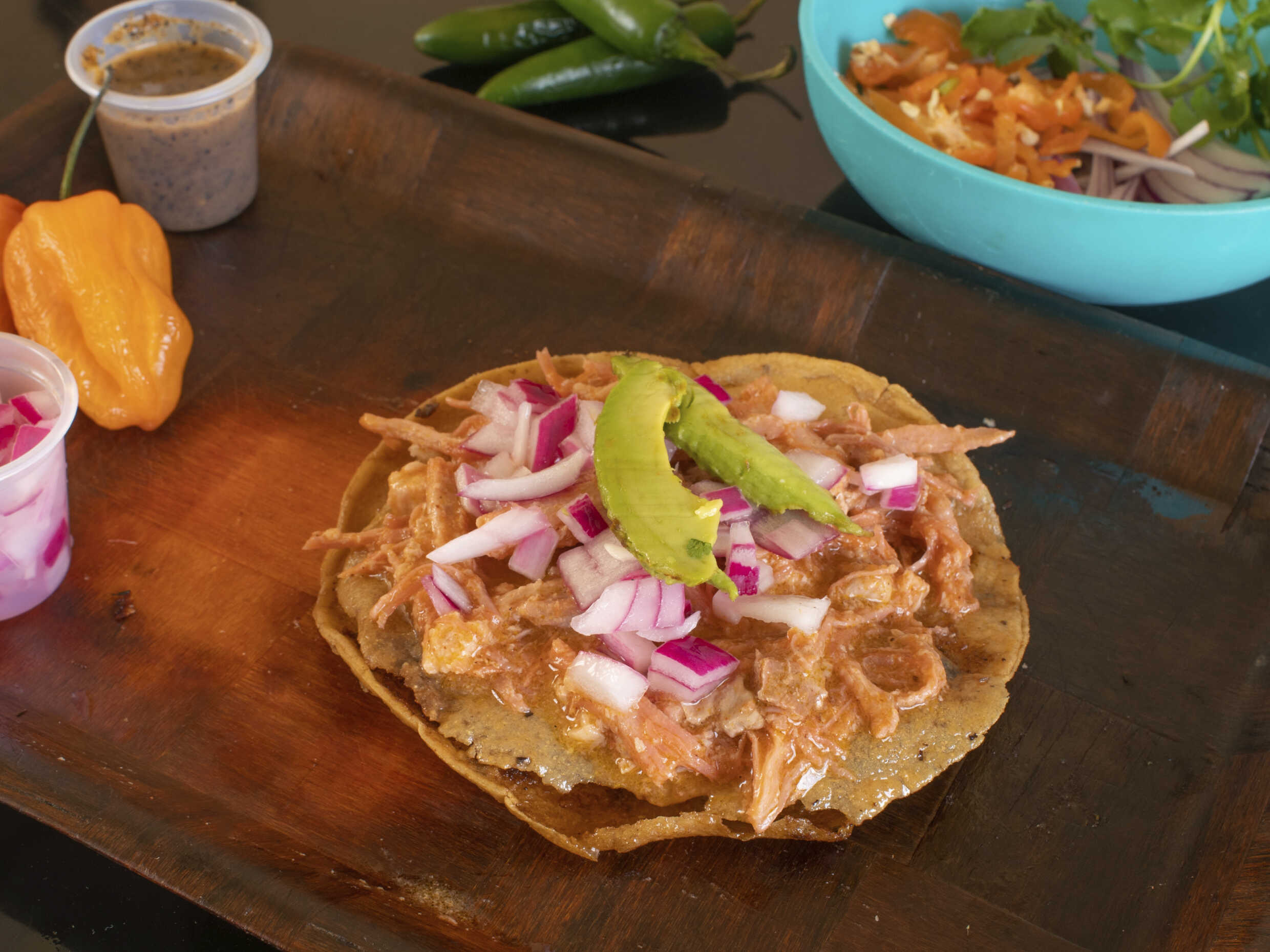Salsa de Habanero con queso fresco, crema, cebollita morada, cilantro, aguacate, gotas de salsa negra y bolillo.