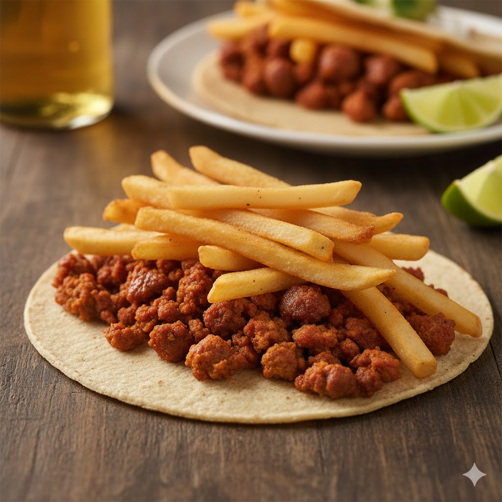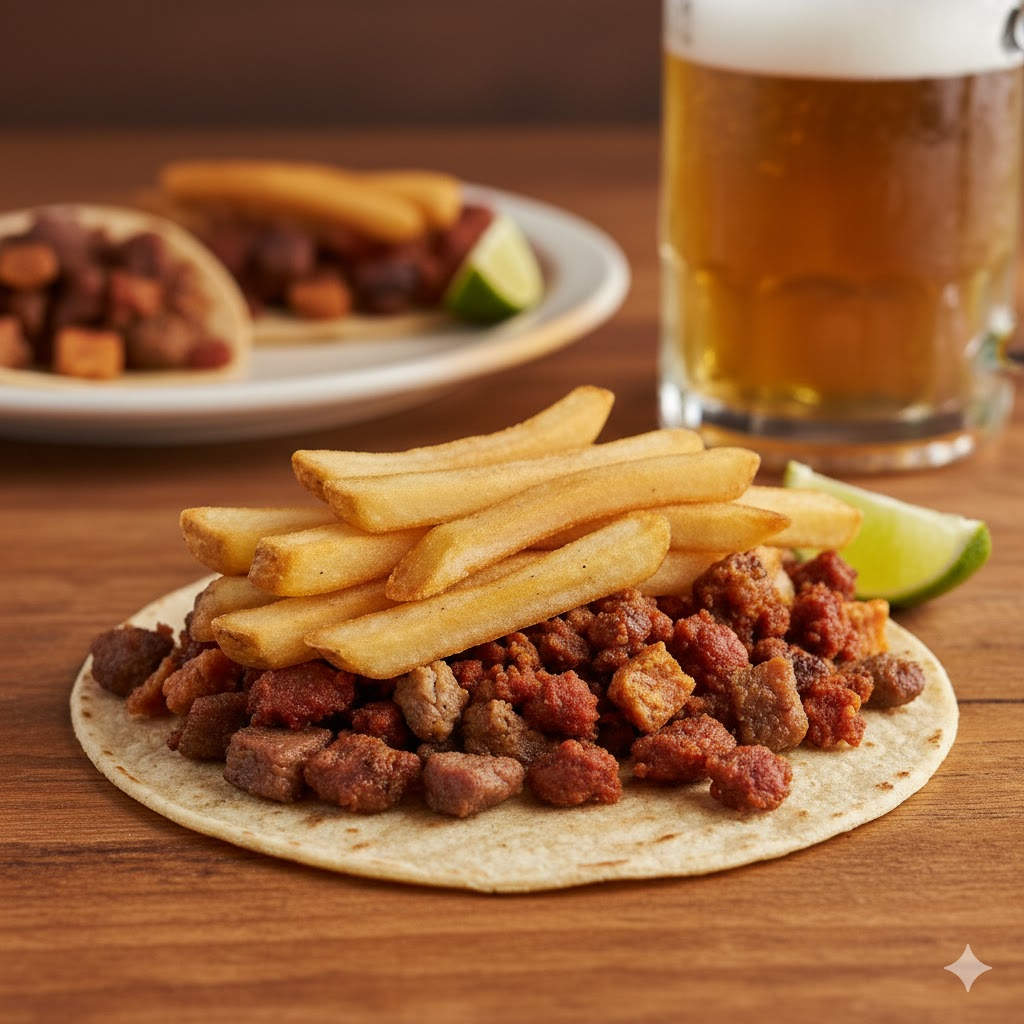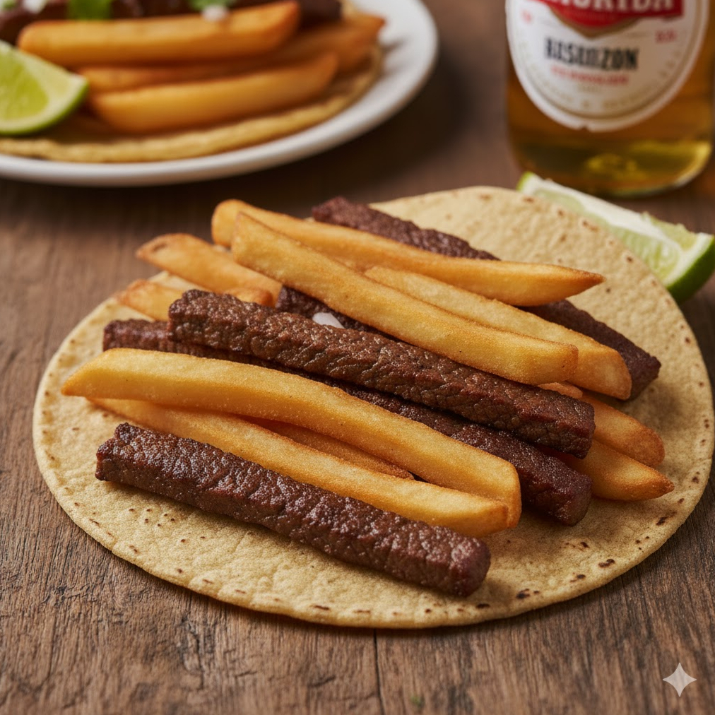 Jugosa carne de cerdo al carbón bistec y chorizo con papas fritas en 1 tortilla de comal acompañado de salsa roja, salsa verde, ensalada de nopales, cebolla morada y limones.