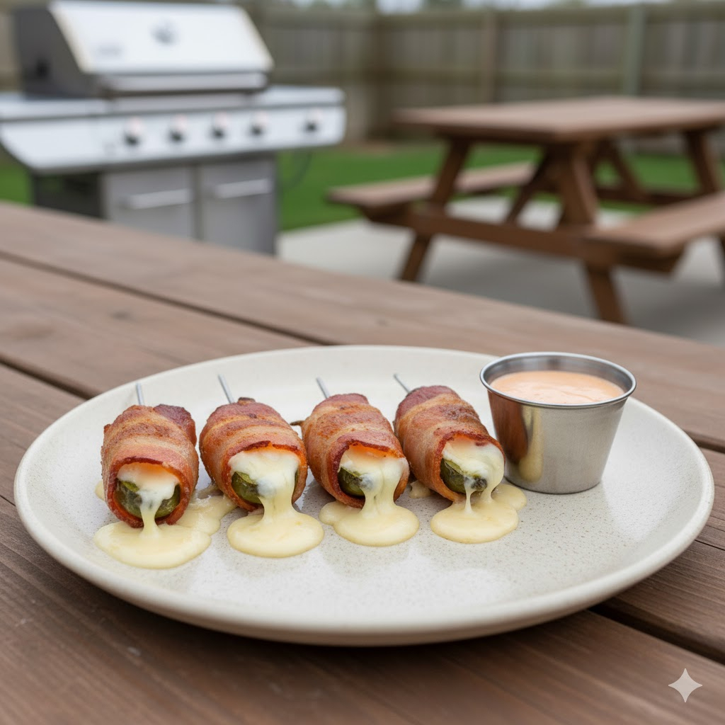 4 pzas De jalapeños rellenos de queso fundido envuelto en un crocante tocino.
