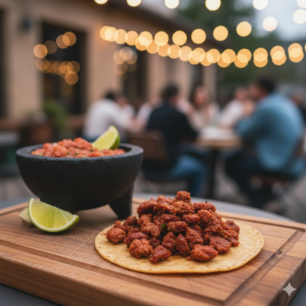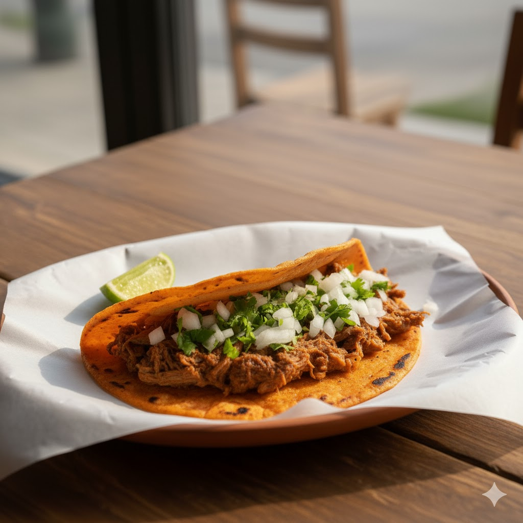 Tortilla de maíz con delicioso estofado de birria, acompañado de cilantro, cebolla, salsas y limones.