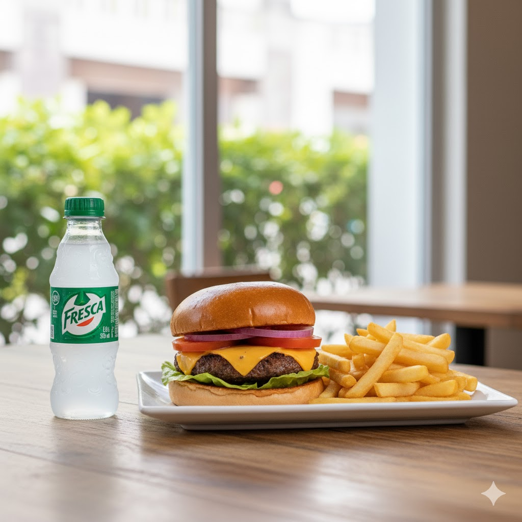 200 g De exquisita arrachera marinada, catsup, mayonesa, jitomate, cebolla morada, tocino, lechuga, queso fundido y coronando con un popper acompañado con papas a la francesa y refresco pet 355 ml.