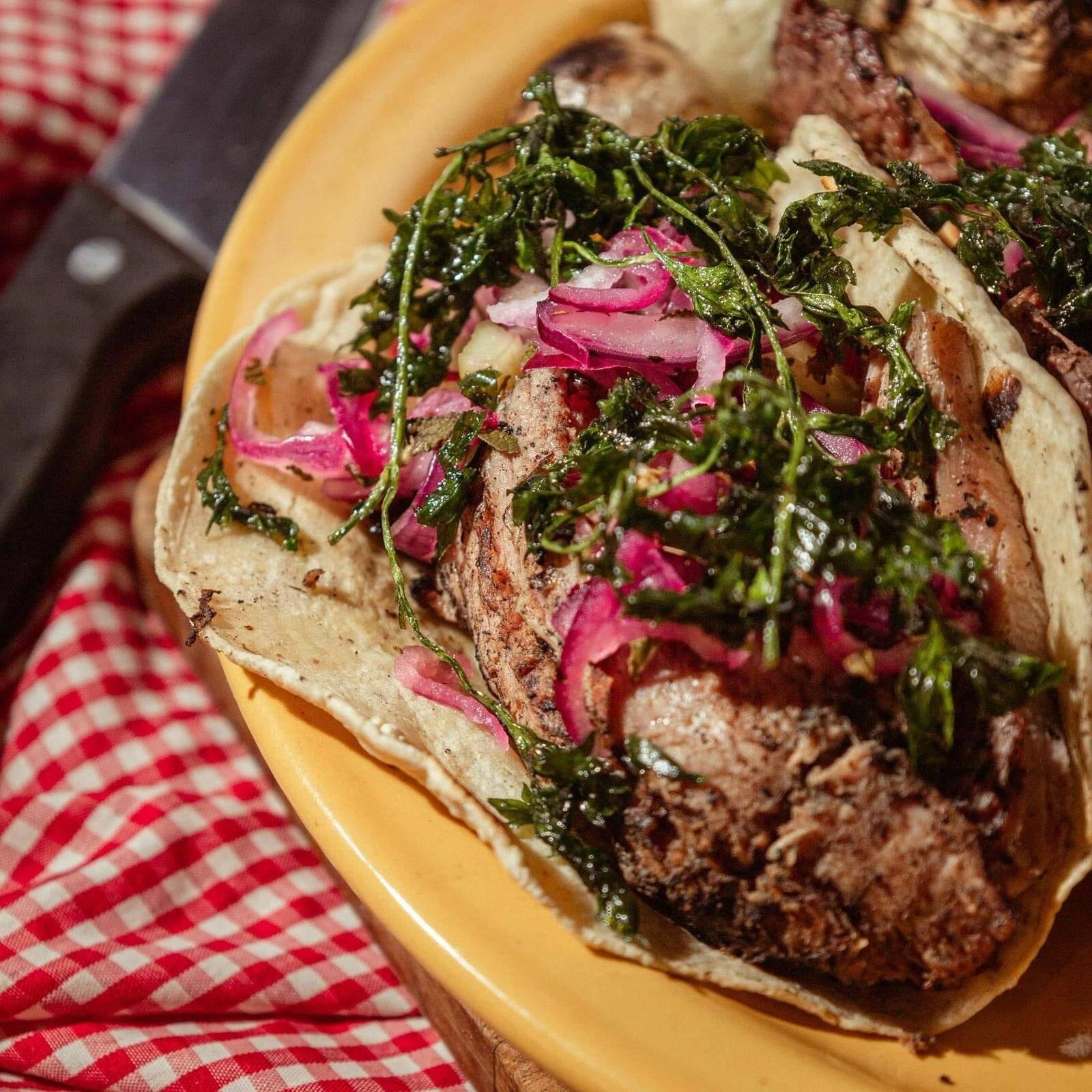 Jugosa carne de cerdo al carbón en 1 tortilla de comal acompañado de salsa roja, salsa verde, ensalada de nopales, cebolla morada y limones.