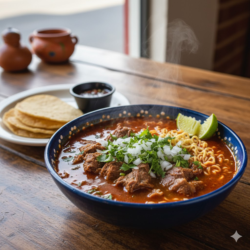 Pasta ramen en consomé y carne de birria, acompañado con cilantro, cebolla y limones.