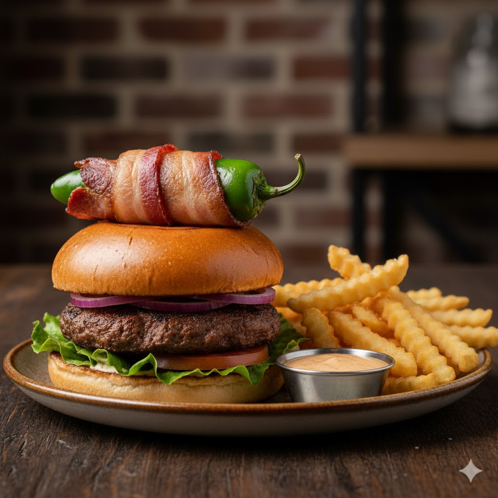 200 g De exquisita arrachera marinada, catsup, mayonesa, jitomate, cebolla morada, tocino, lechuga, queso fundido y coronando con un popper, acompañado con papas a la francesa.