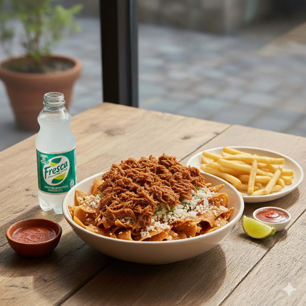 Totopos crujientes bañados en consomé y carne de birria y 1 refresco pet 355 ml de sabor acompañado de cilantro, cebolla, limones.