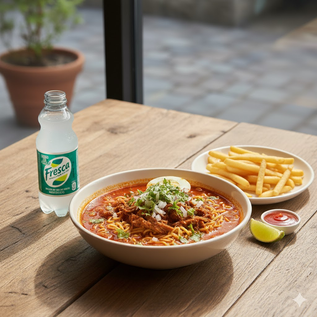 Pasta ramen en consomé y carne de birria más papas a la francesa y refresco pet 355 ml de sabor acompañado con cilantro, cebolla, limones.
