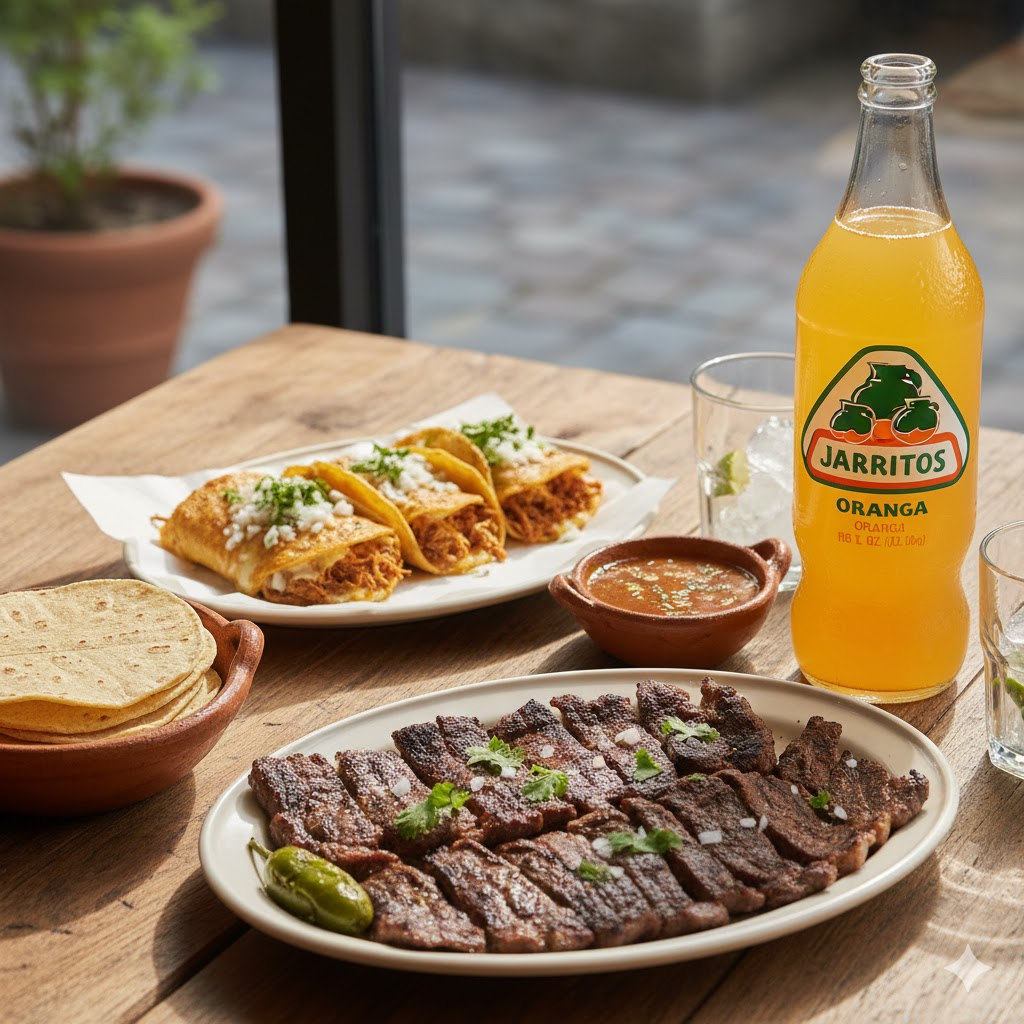 Medio kilo De mix de carne al carbón, arrachera, costilla chistorra, argentino, chorizo huasteco, picaña, roast beef, sirloin, acompañada de 2 pzas de elote americano, 2 quesadillas, 2 poppers, 2 consomés, salsa verde, salsa roja, nopalitos, limones, cebollas cambray, 500 g De tortillas y refresco de sabor 2 L.
