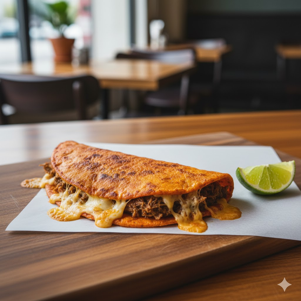 Tortilla de harina rellena de birria y queso derretido, mojada en el consomé de birria y acompañada de salsas y limones.