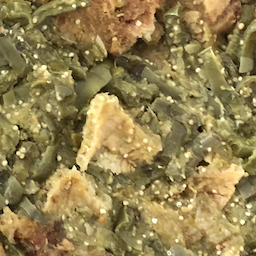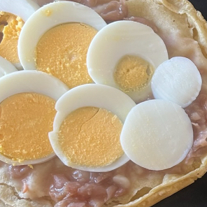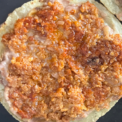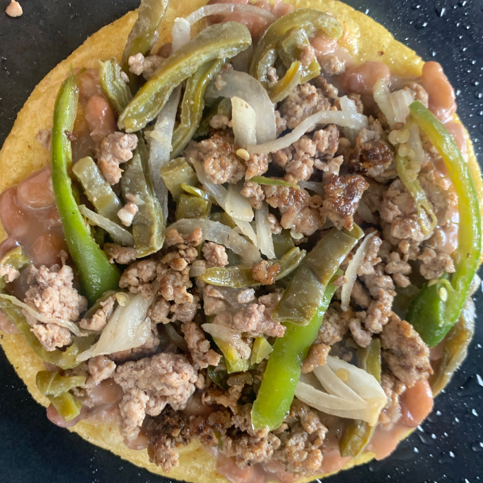 Capa de frijol con chicharrón prensado, crema y queso al gusto