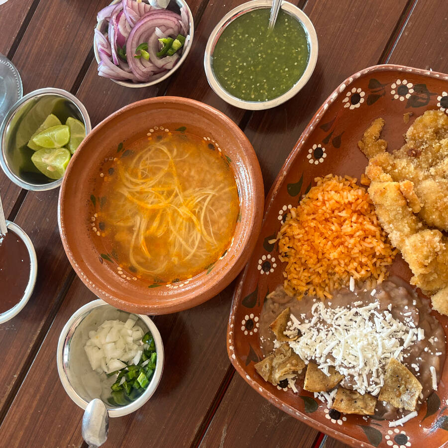 Dos sopas, plato fuerte y agua de sabor natural. Incluye tortillas y salsas.