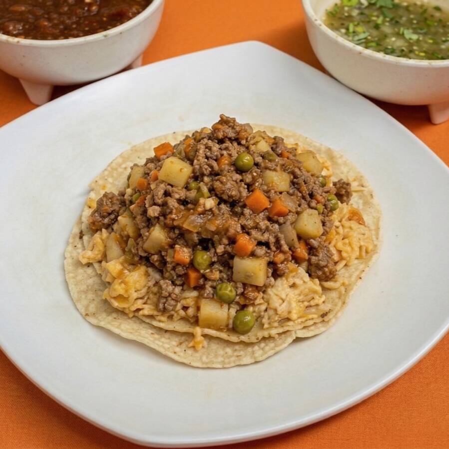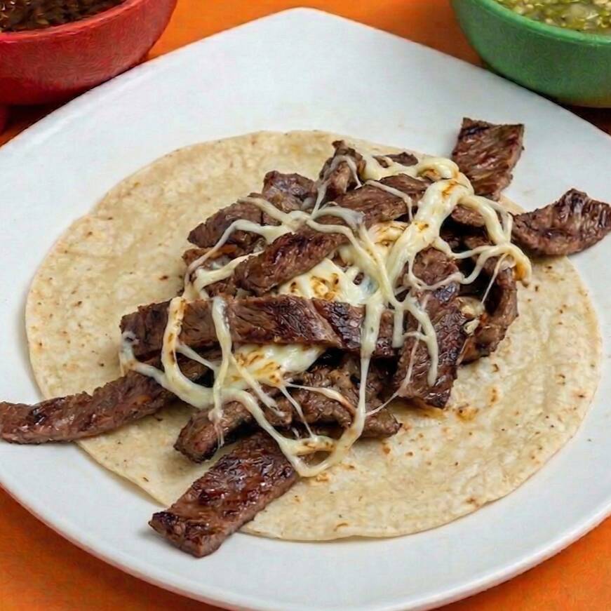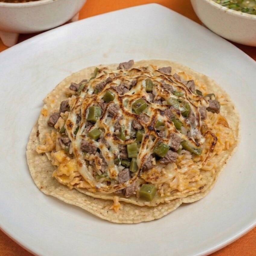 Sábana de cecina de res combinada con el clásico quesillo de hebra fundido.