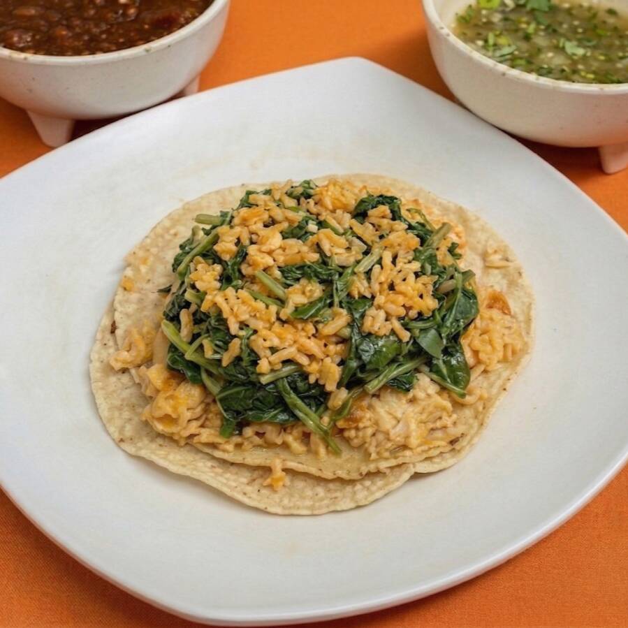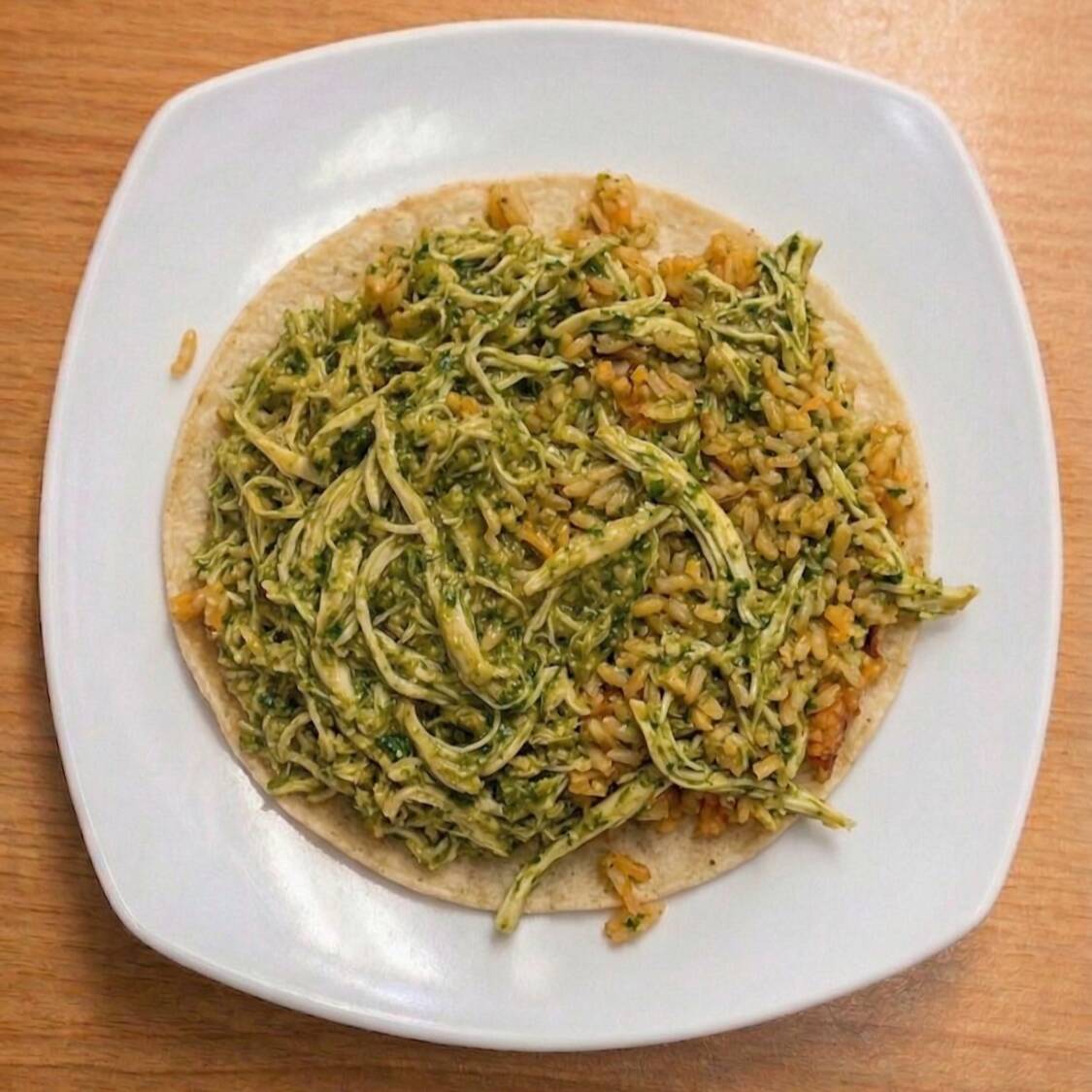 Pechuga de pollo deshebrada bañada en mole verde tradicional a base de pepita.