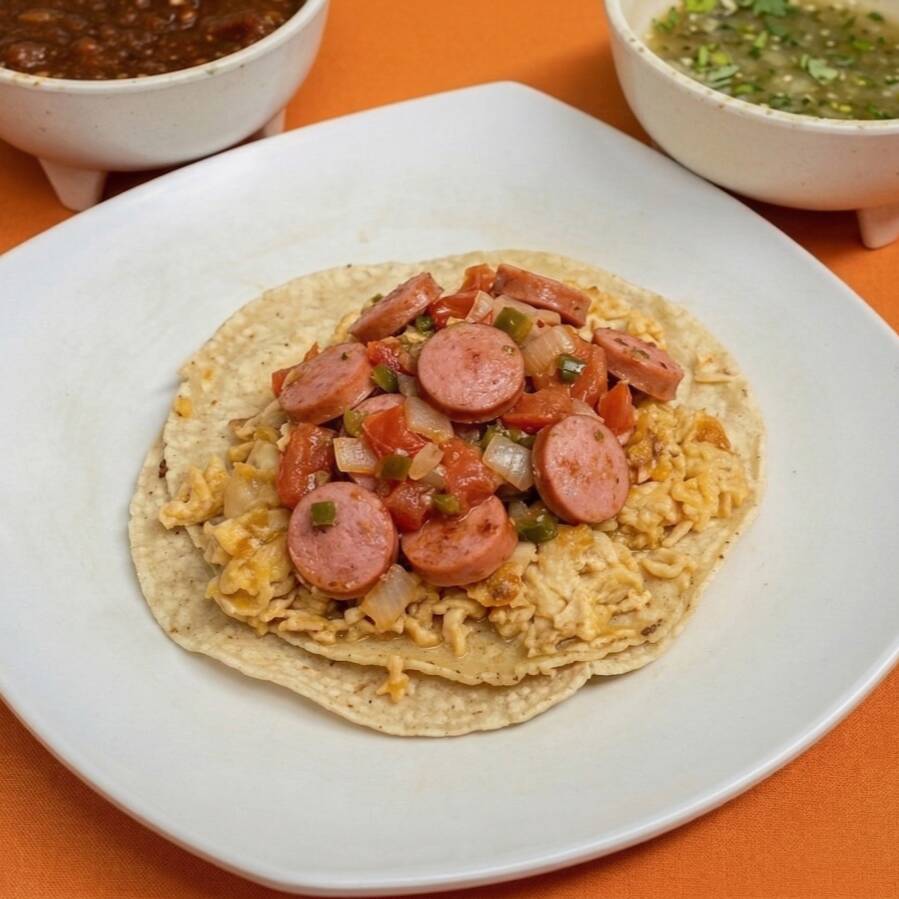 Pollo deshebrado con cebolla en salsa de tomate y chipotle con queso.