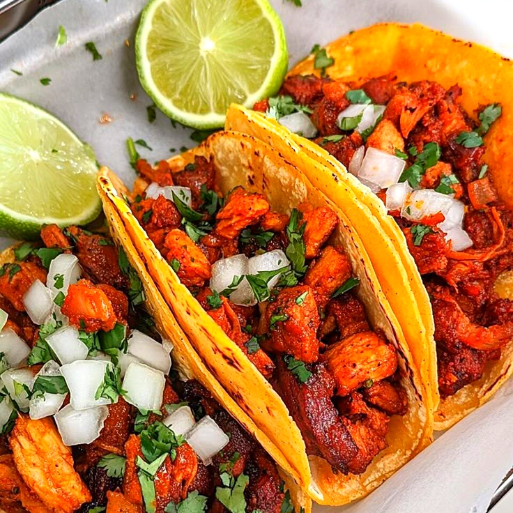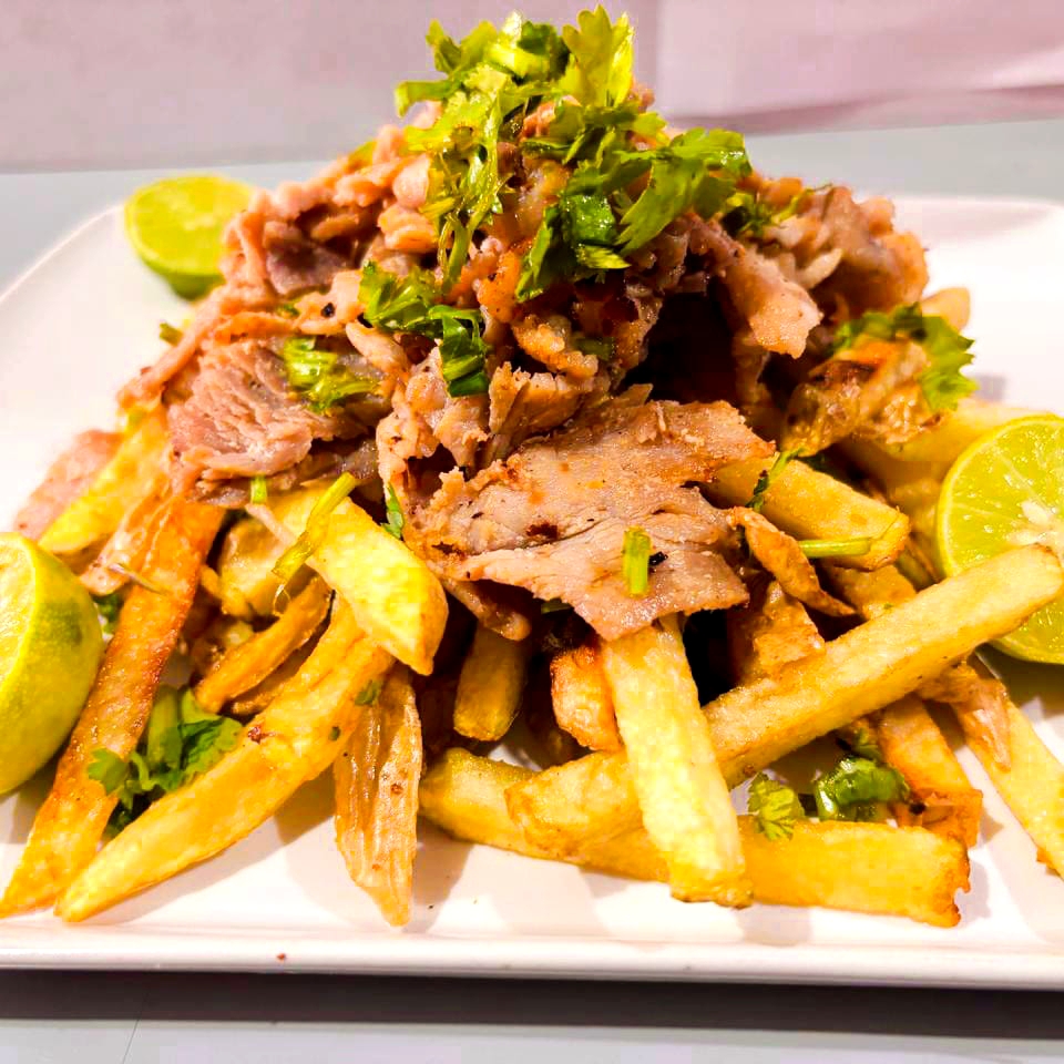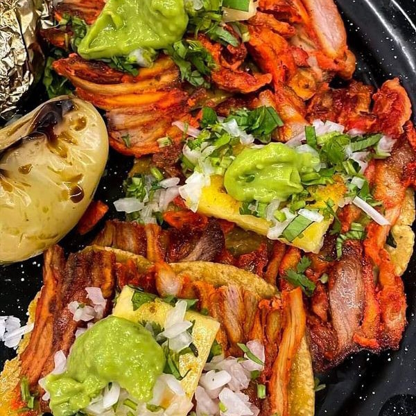 Taco al pastor con doble tortilla grande, papas , piña , cebolla , limones y salsas verde y roja