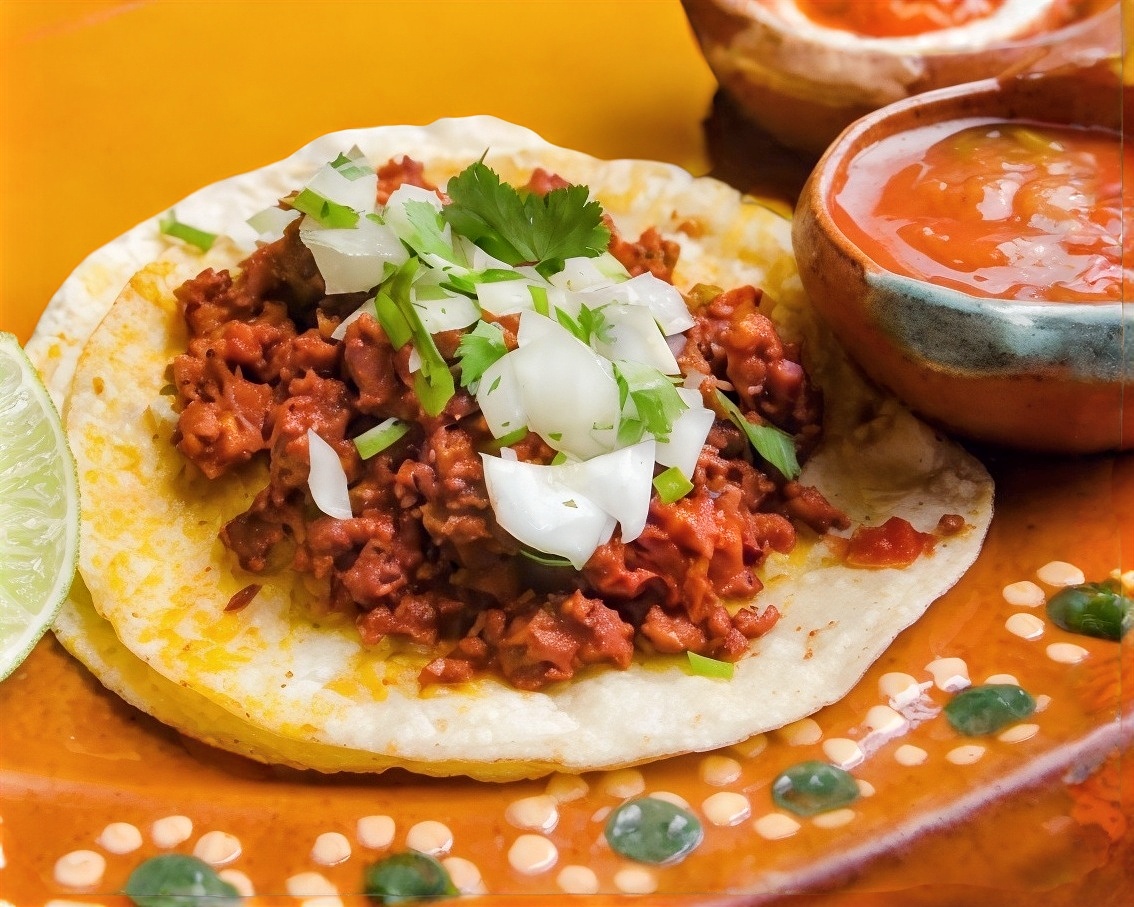 Tortilla de maíz con bistec, cebolla, cilantro, salsa y limón.