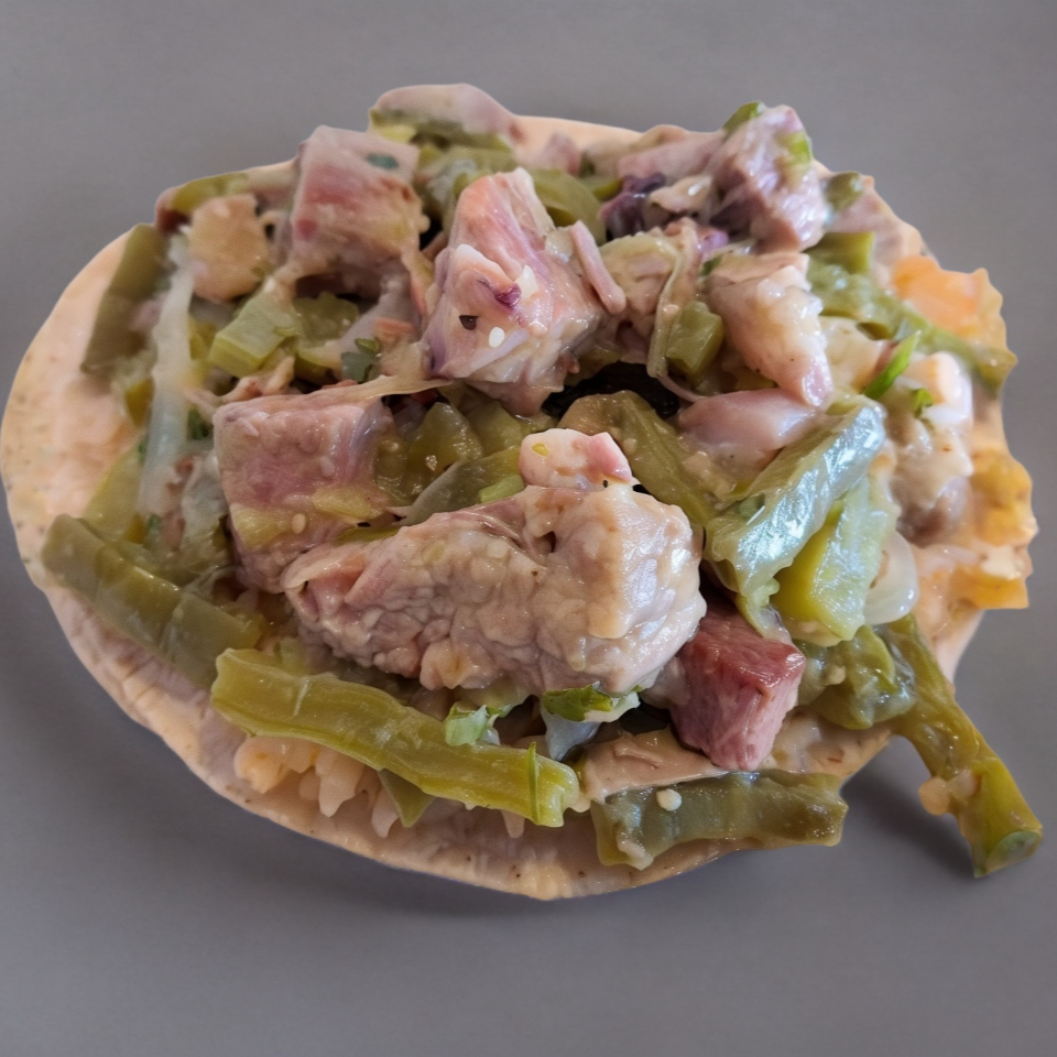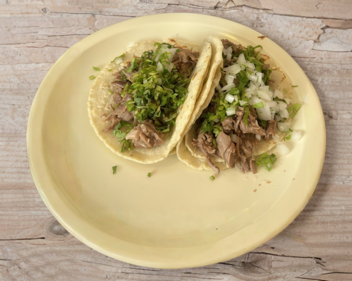 Tacos de doble tortilla a mano con arroz de complemento de 3 guisados: rajas con pollo a la crema, de alambre, y de longaniza con papas incluye bebida