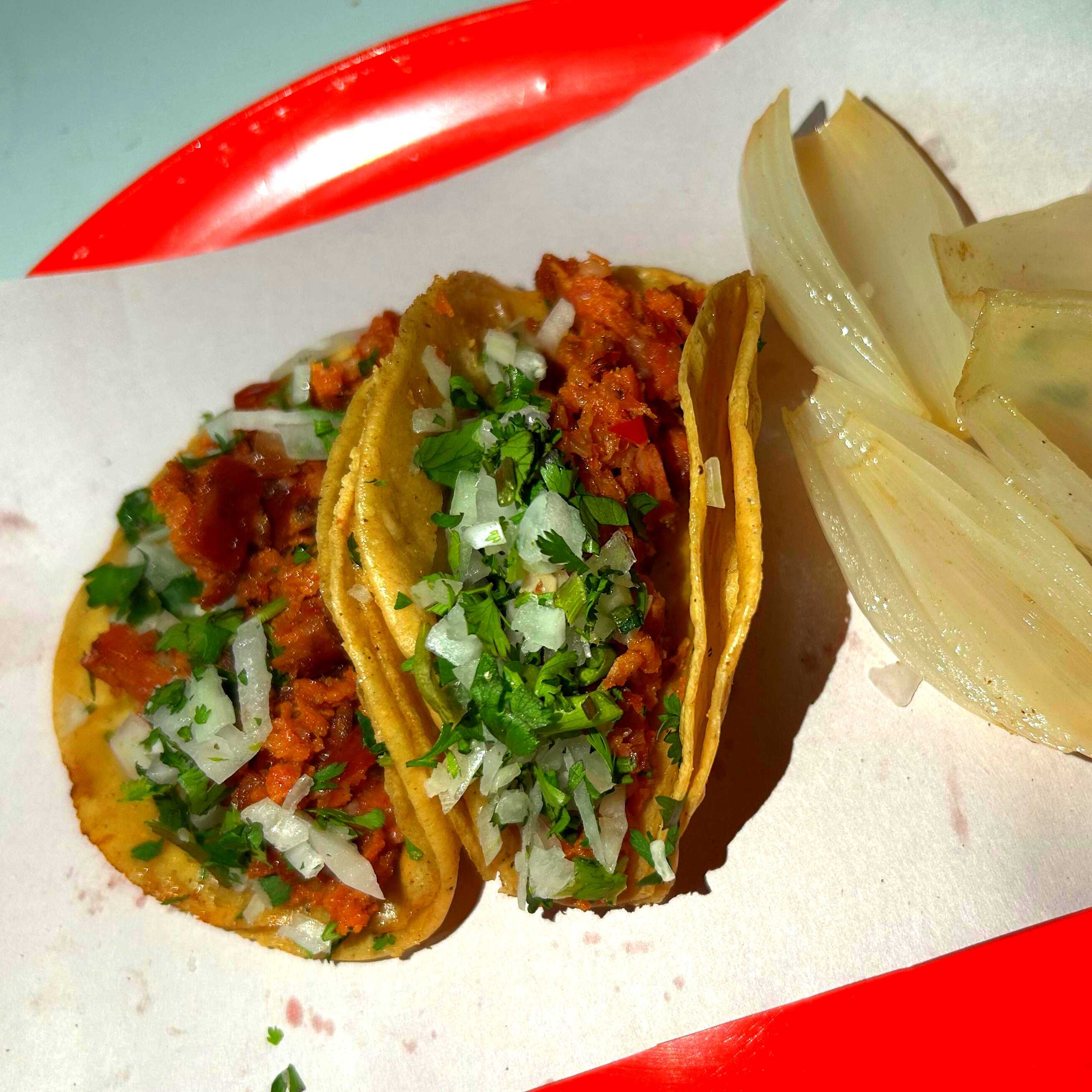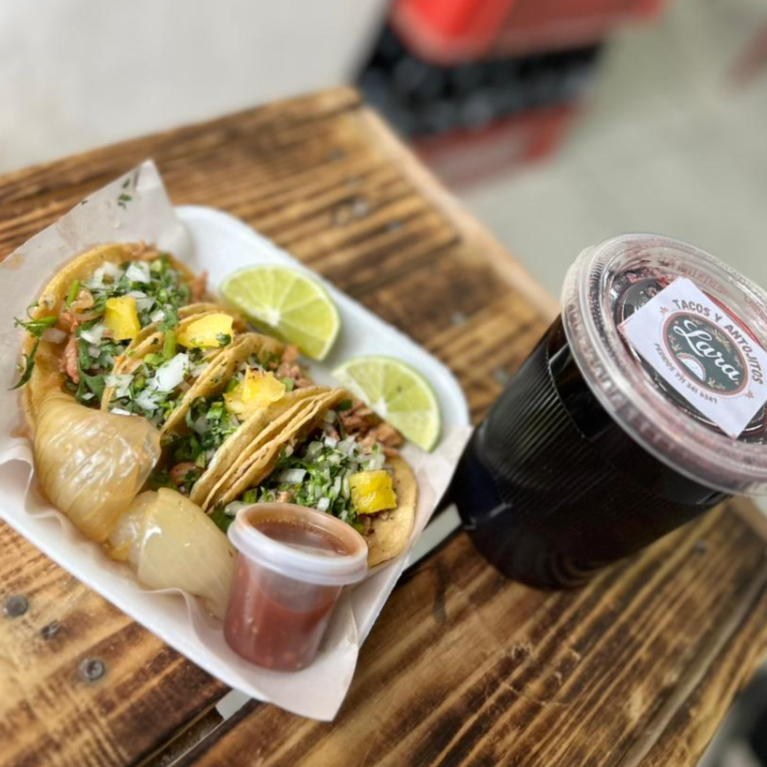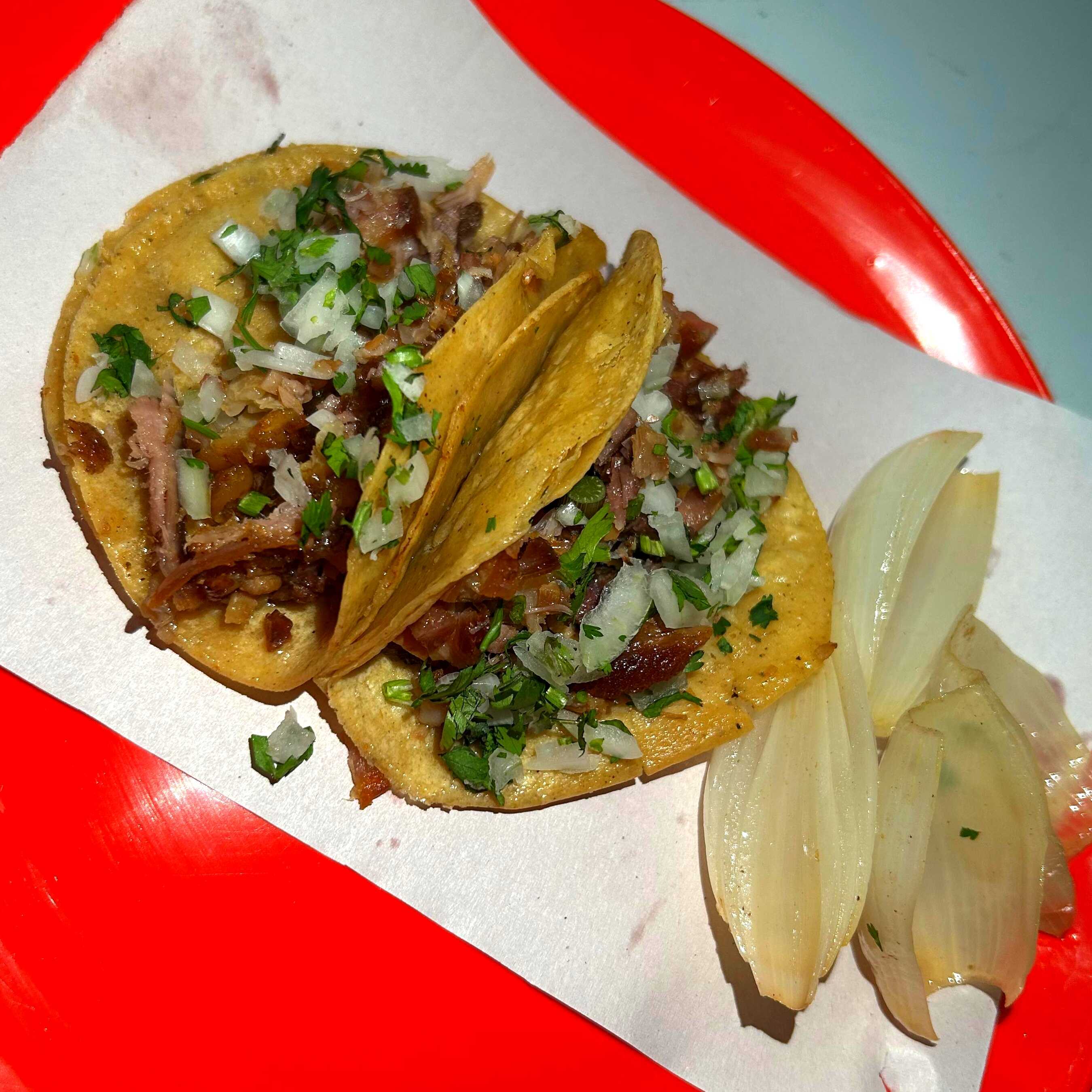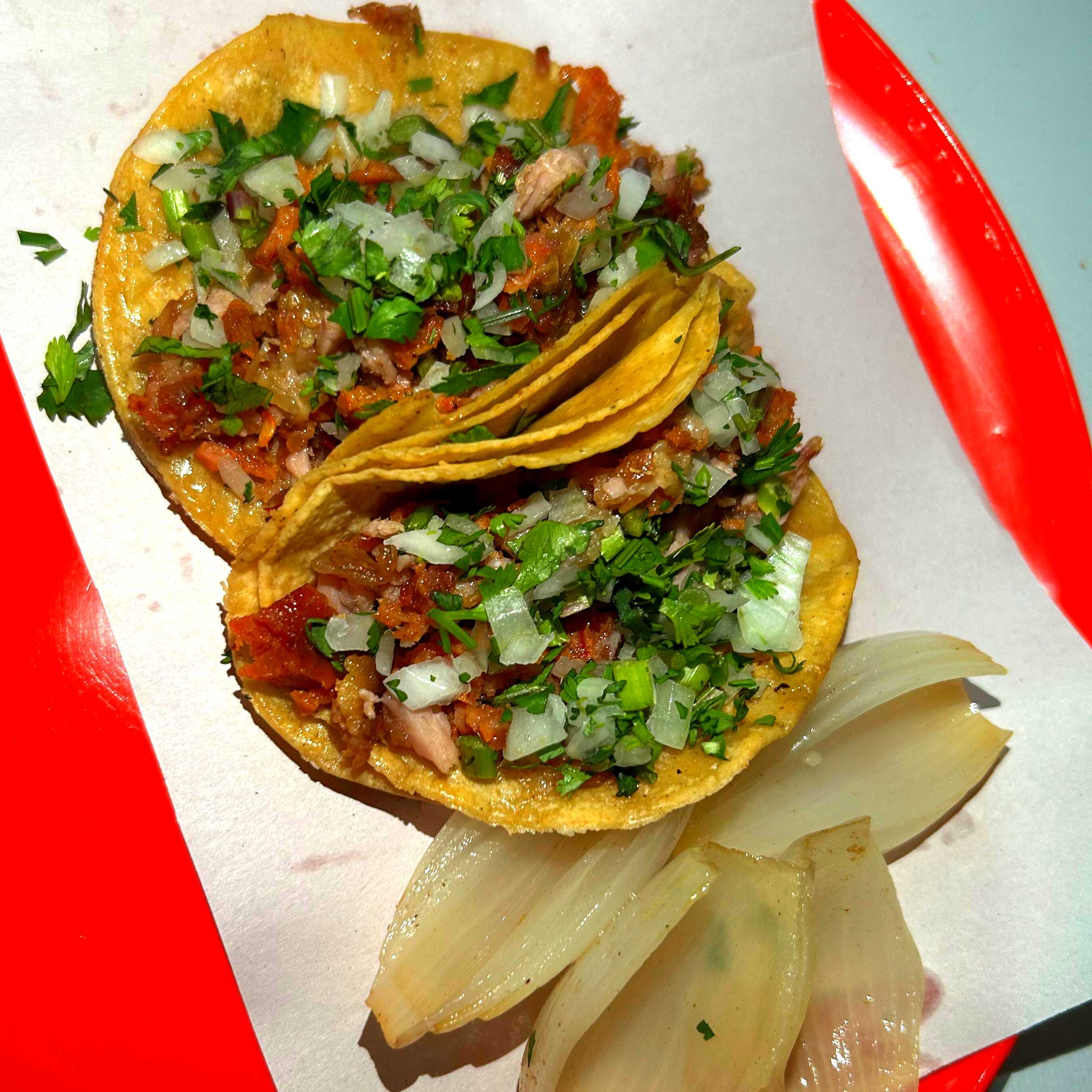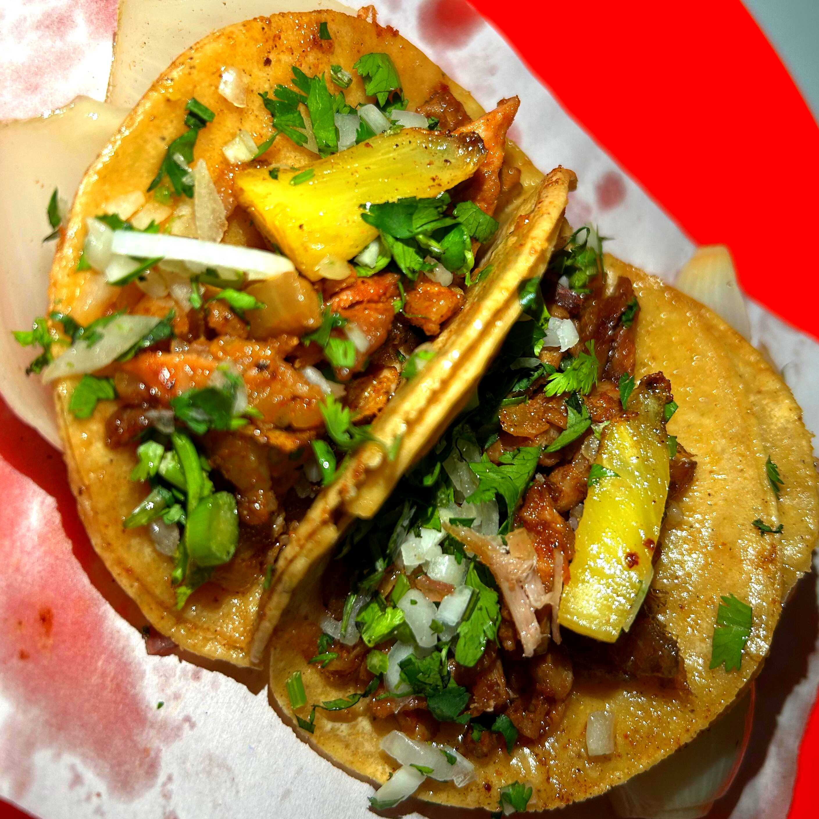 Deliciosos tacos de al pastor acompañados con piña cebolla crambay