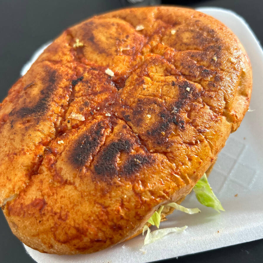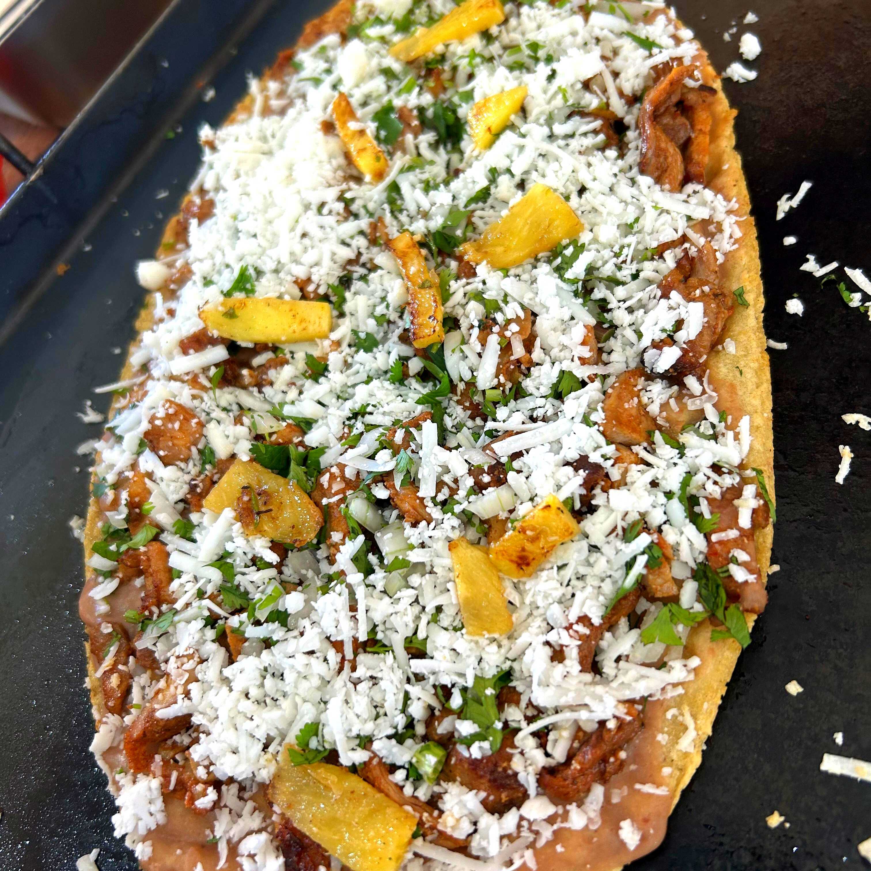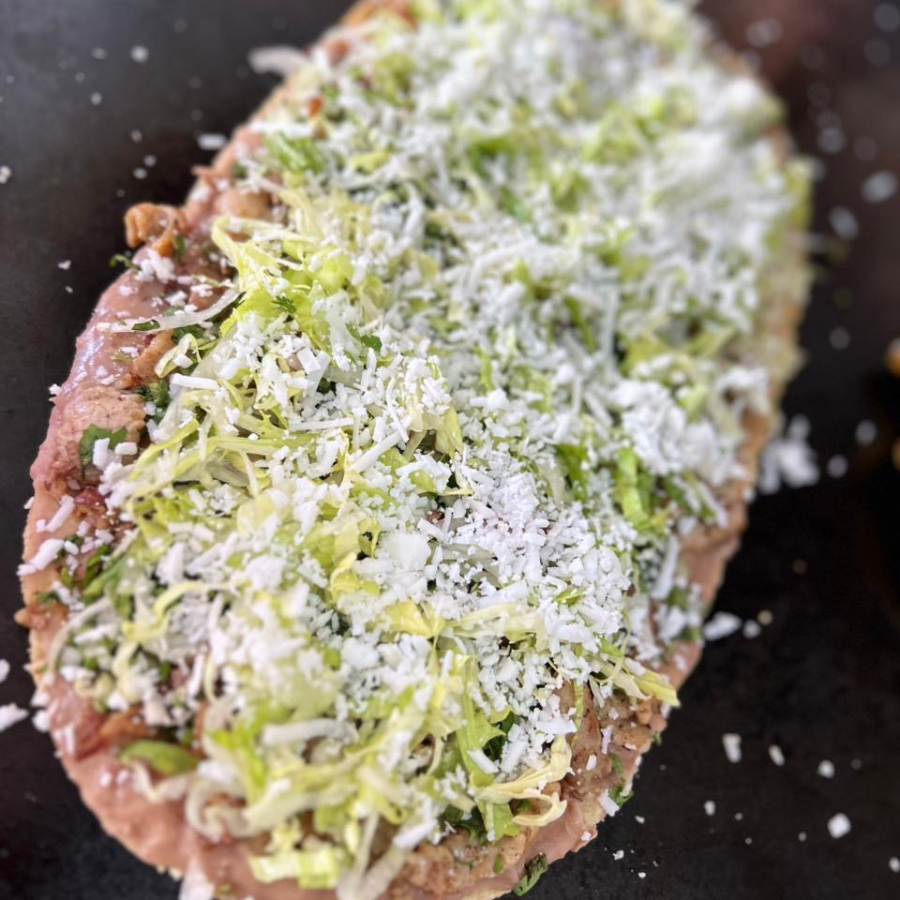 Delicioso huarache de masa grande hecha al momento, con una capa de frijol, con tinga, queso y lechuga.