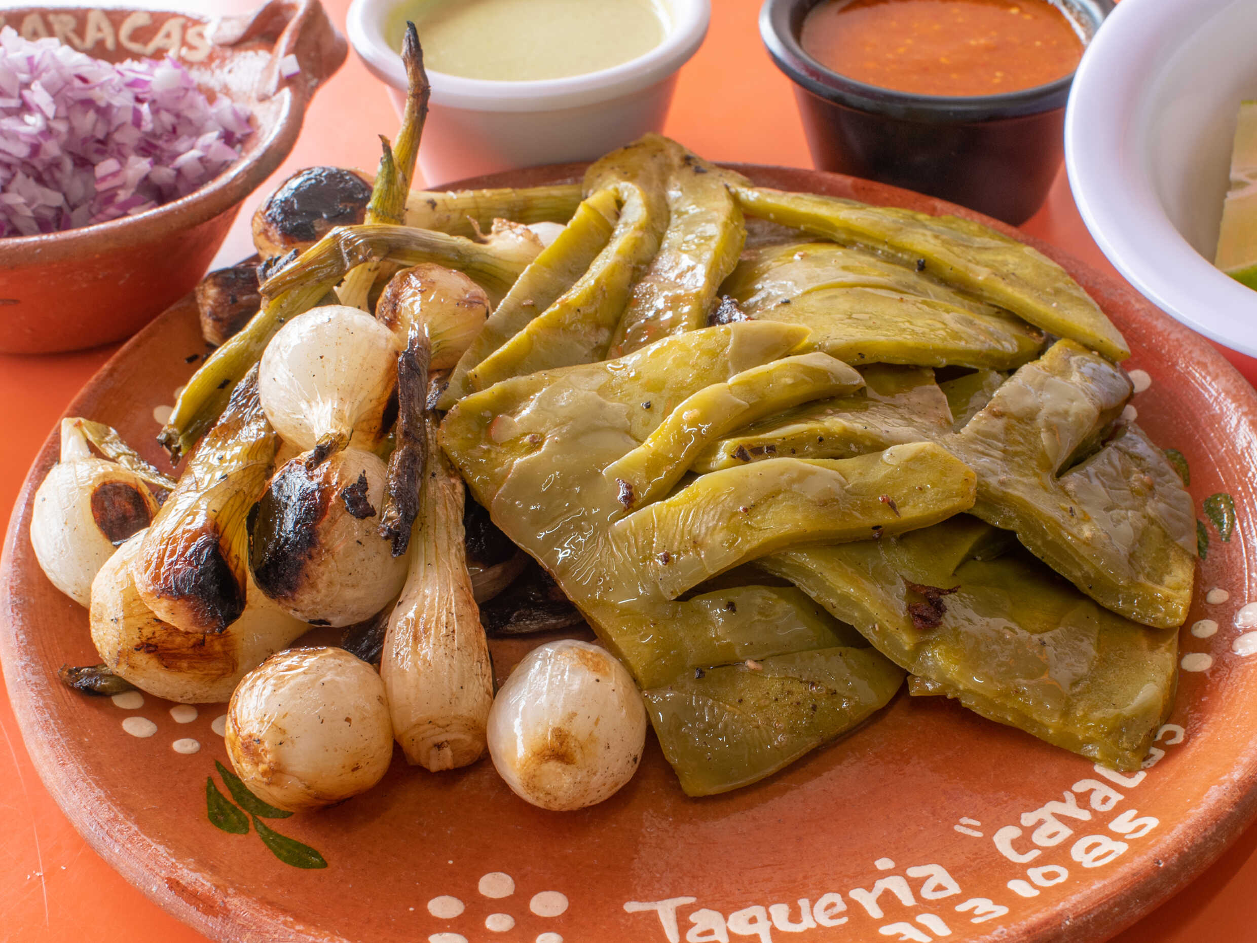 Bistec, tocino, cebolla, pimiento morrón, chorizo, queso Oaxaca y tortillas
