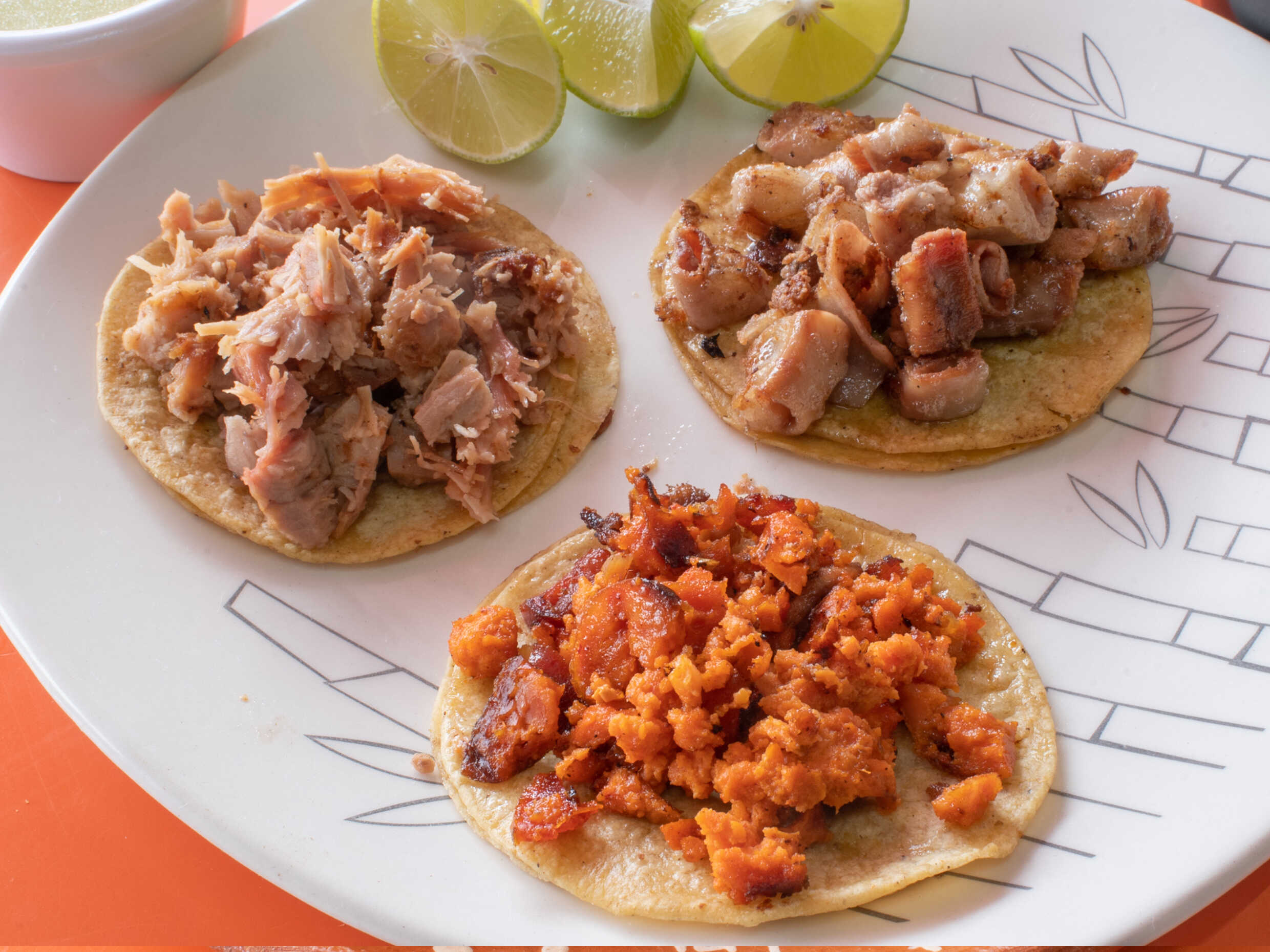 5 Tacos con tortilla doble, acompañados de salsas y limón. Escoge tu carne preferida