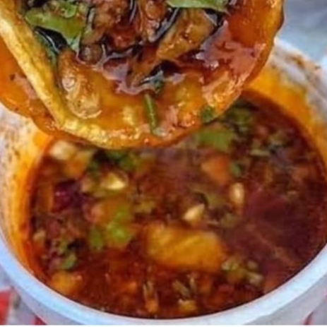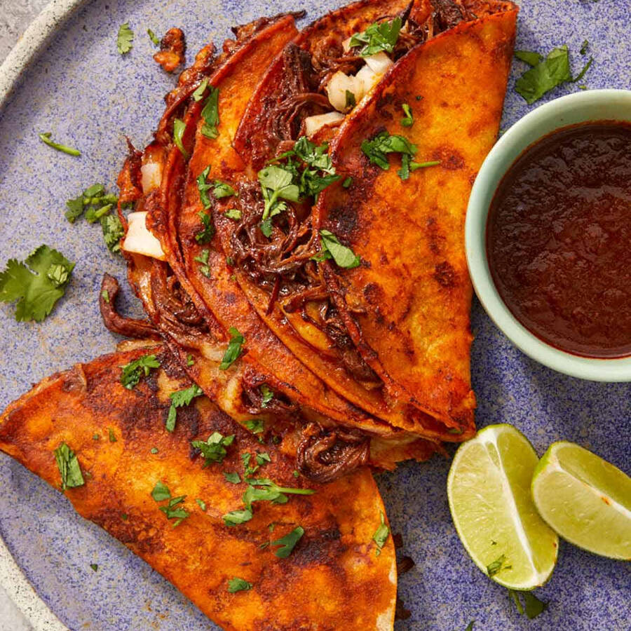 Tortilla de maíz dorada y crujiente bañada en caldo , rellena de birria y delicioso queso fundido