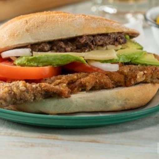 pan,cama de frijoles refritos , jitomate , aguacate ,nuestra deliciosa milanesa de res y queso.