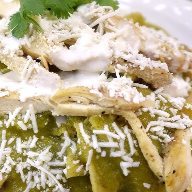 Totopos bañados en deliciosa salsa verde o roja a tu elección, aderezados con crema y queso