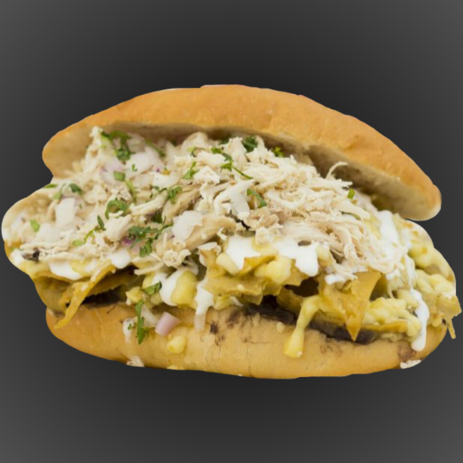 Deliciosa torta de chilaquiles con salsa de tu elección aderezados con frijoles, crema y queso.