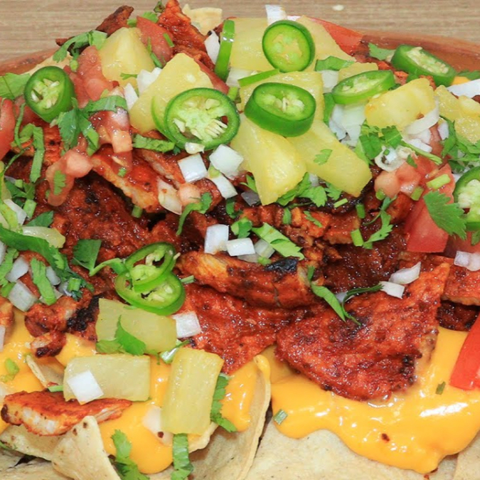Crujientes totopos bañados de frijoles ,queso amarillo de la casa ,queso gratinado ,jalapeños, guacamole y dos carnes a elegir ( Pastor, Bistec ,Chorizo y carne enchilada. )