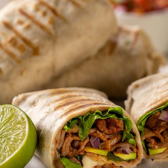 Tortilla de Harina grande ,cama de frijoles refritos, lechuga orgánica ,nuestra deliciosa carne al pastor y queso .