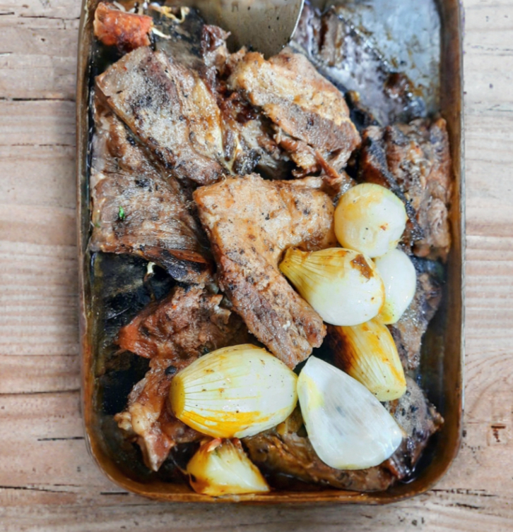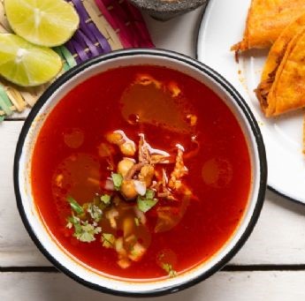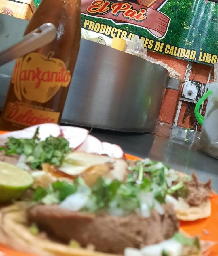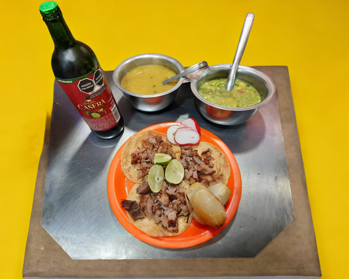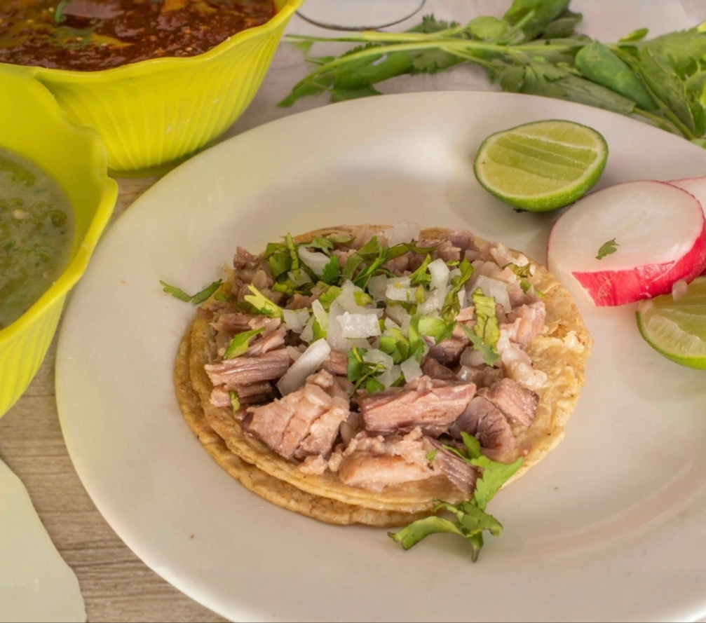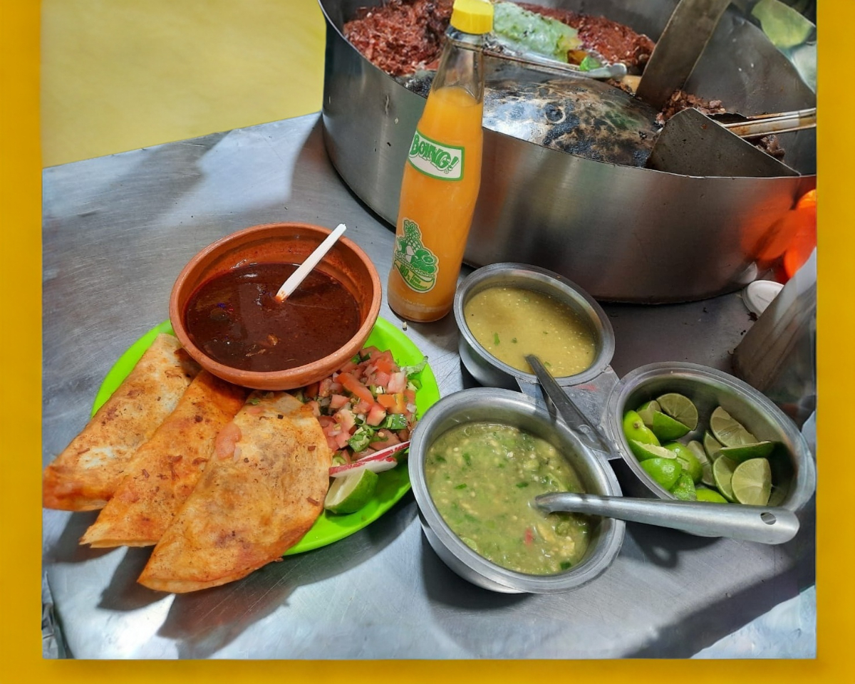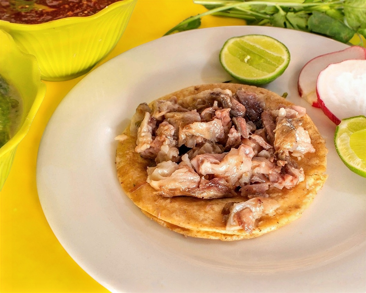 Carne maciza de cabeza de res, gratinado con queso Oaxaca, acompañada con salsas y guarniciones.
