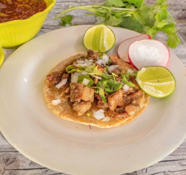 Un irresistible taco de carne de res suadero con cilantro fresco y cebolla picada (vegetales y complementos se envían por aparte).