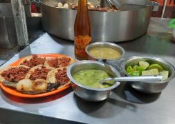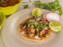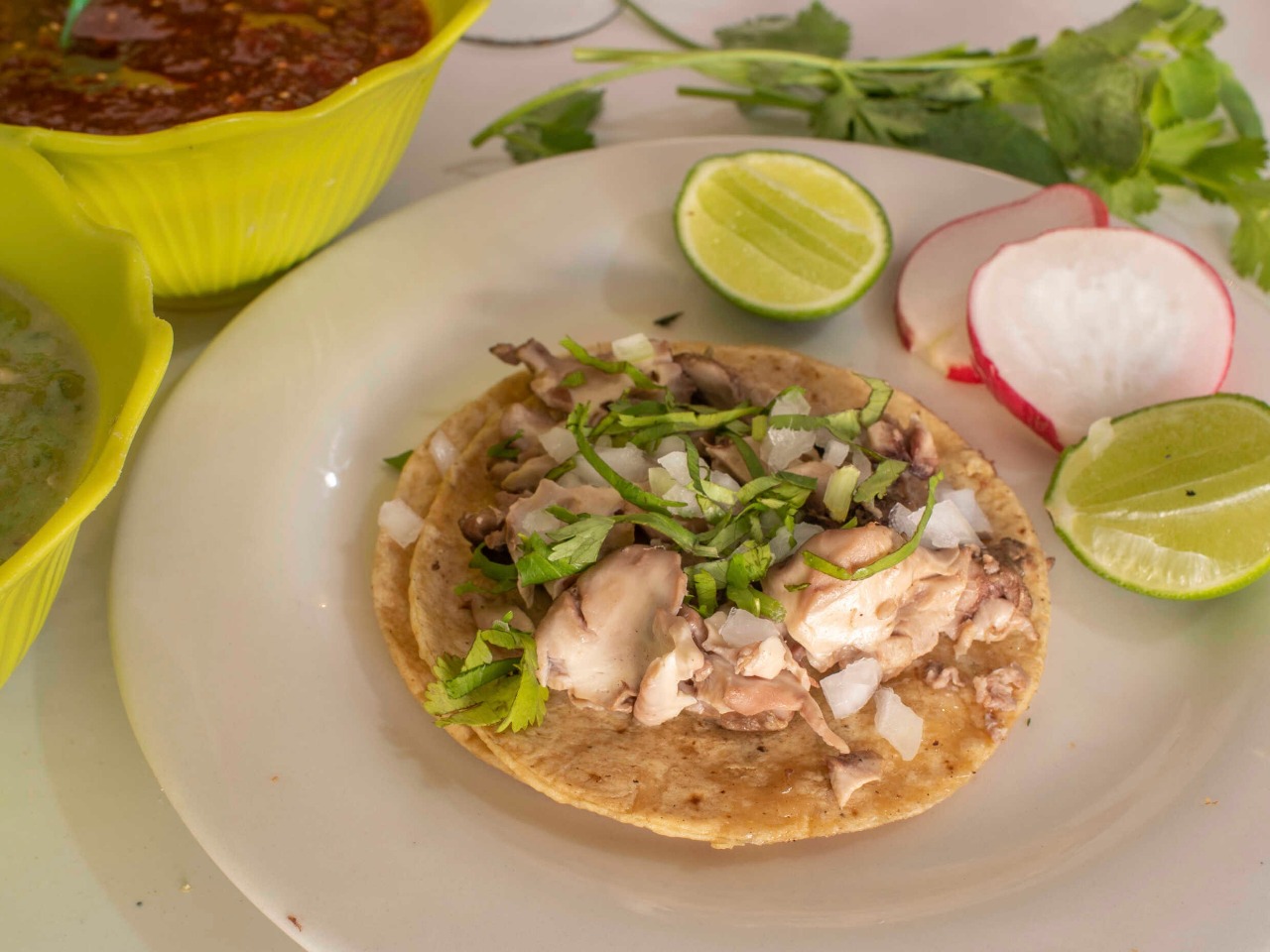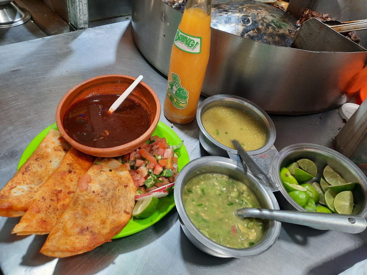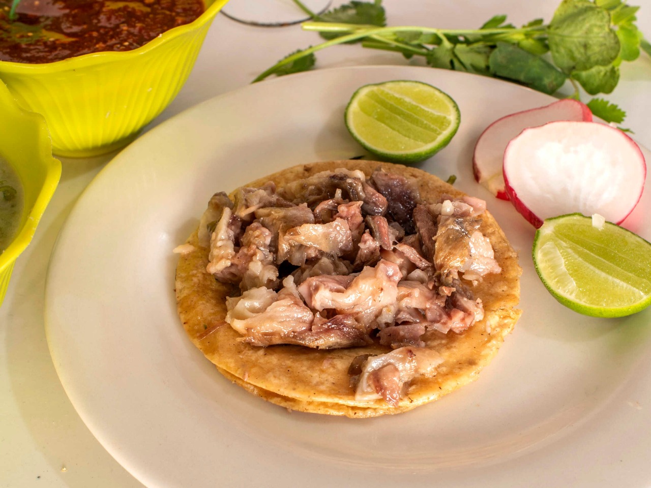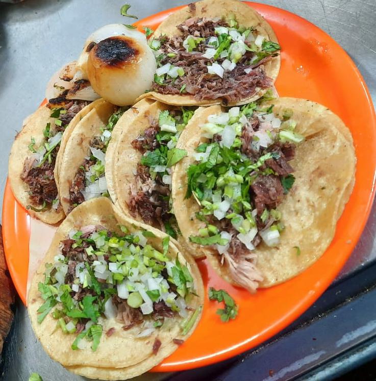 Carne maciza de cabeza de res, gratinado con queso Oaxaca, acompañada con salsas y guarniciones.