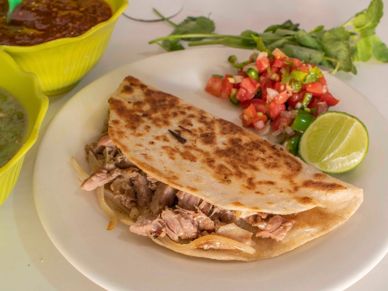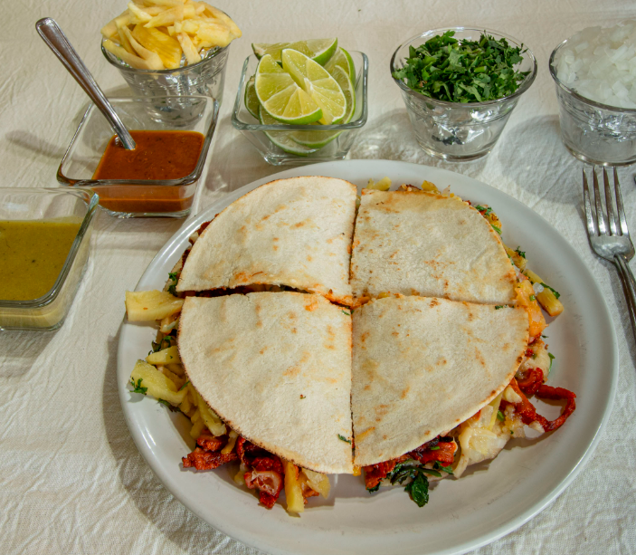 Tortilla de harina, gratinado con queso Oaxaca, acompañada con salsas y guarniciones.