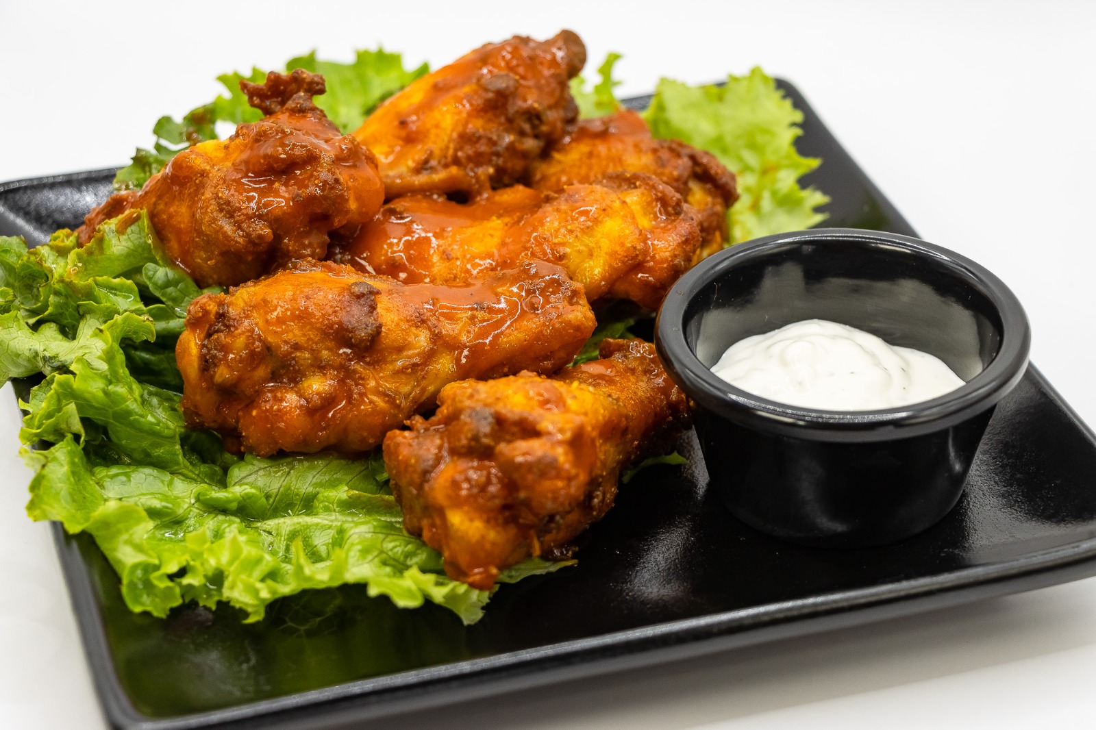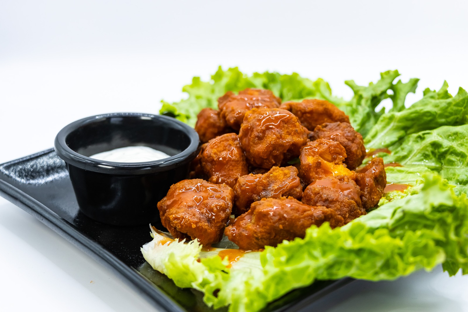 Jugoso y crujiente pedazo de pollo bañado en salsa Buffalo acompañado con hojas de fresca lechuga aderezada con salsa ranch v suave pan brioche.