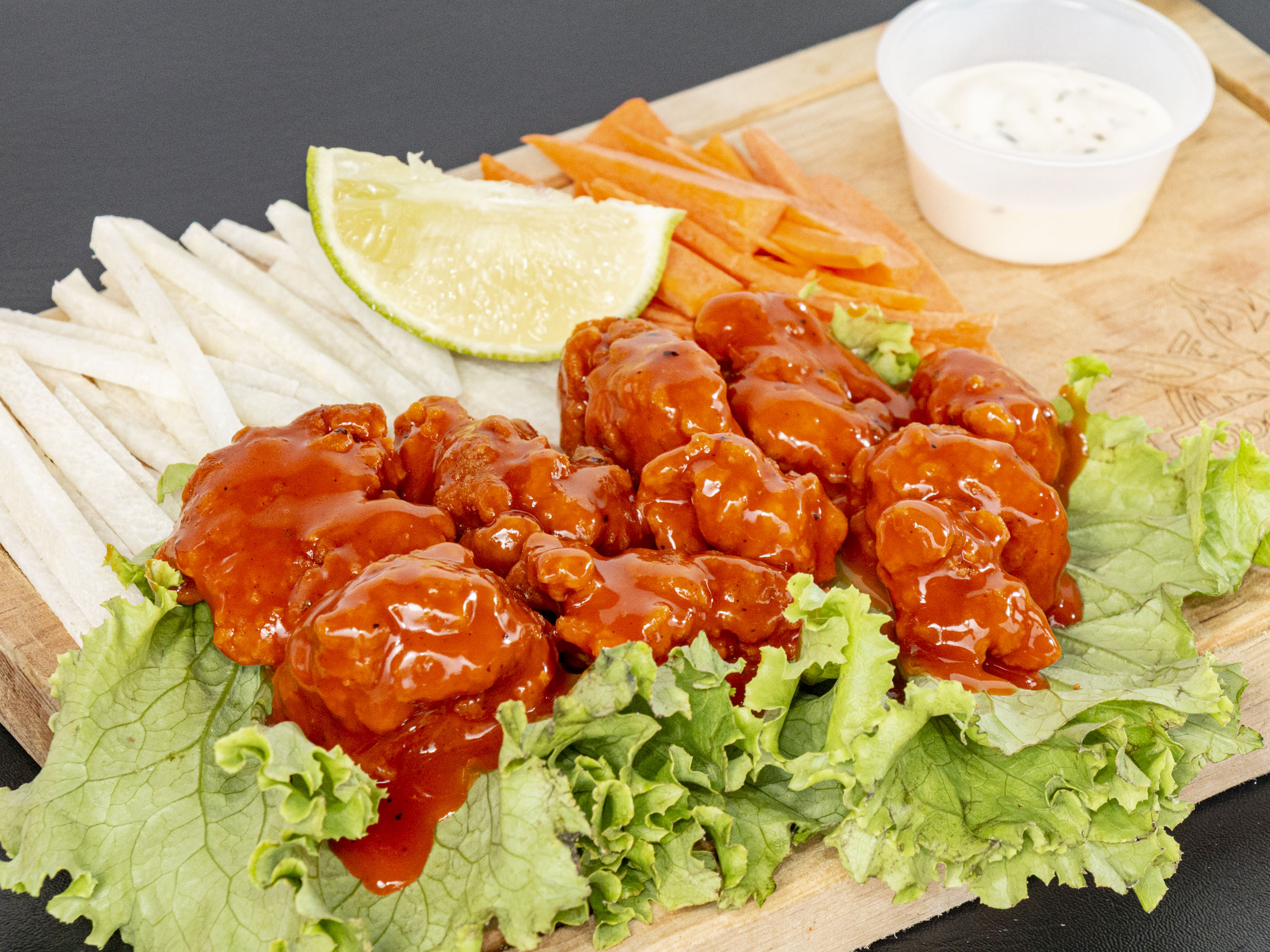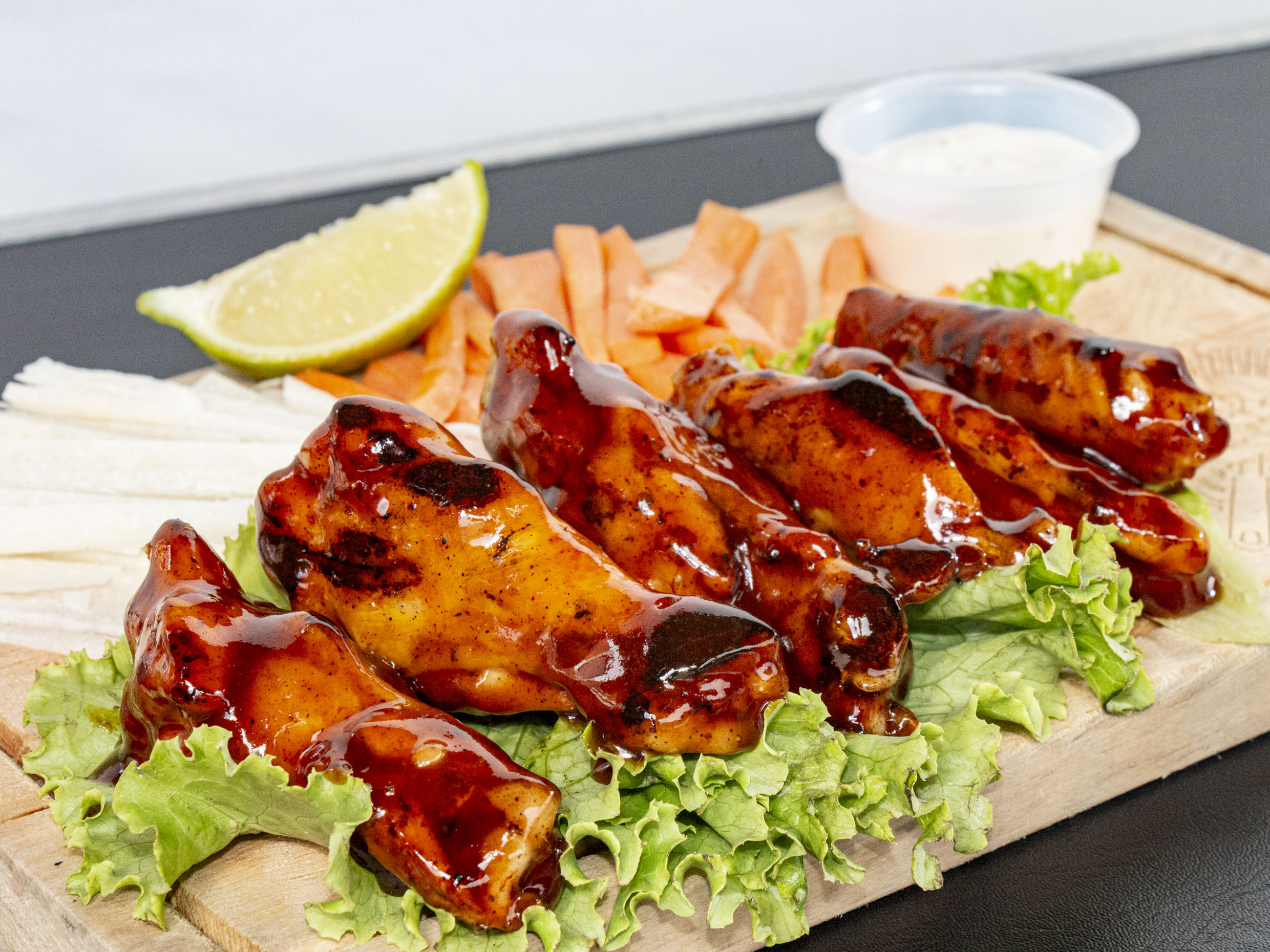 8 pzas. (200g.) De la mejor calidad, bañados en las salsas de tu preferencia, acompañados de bastones de zanahoria y pepino con aderezo ranch GRATIS.