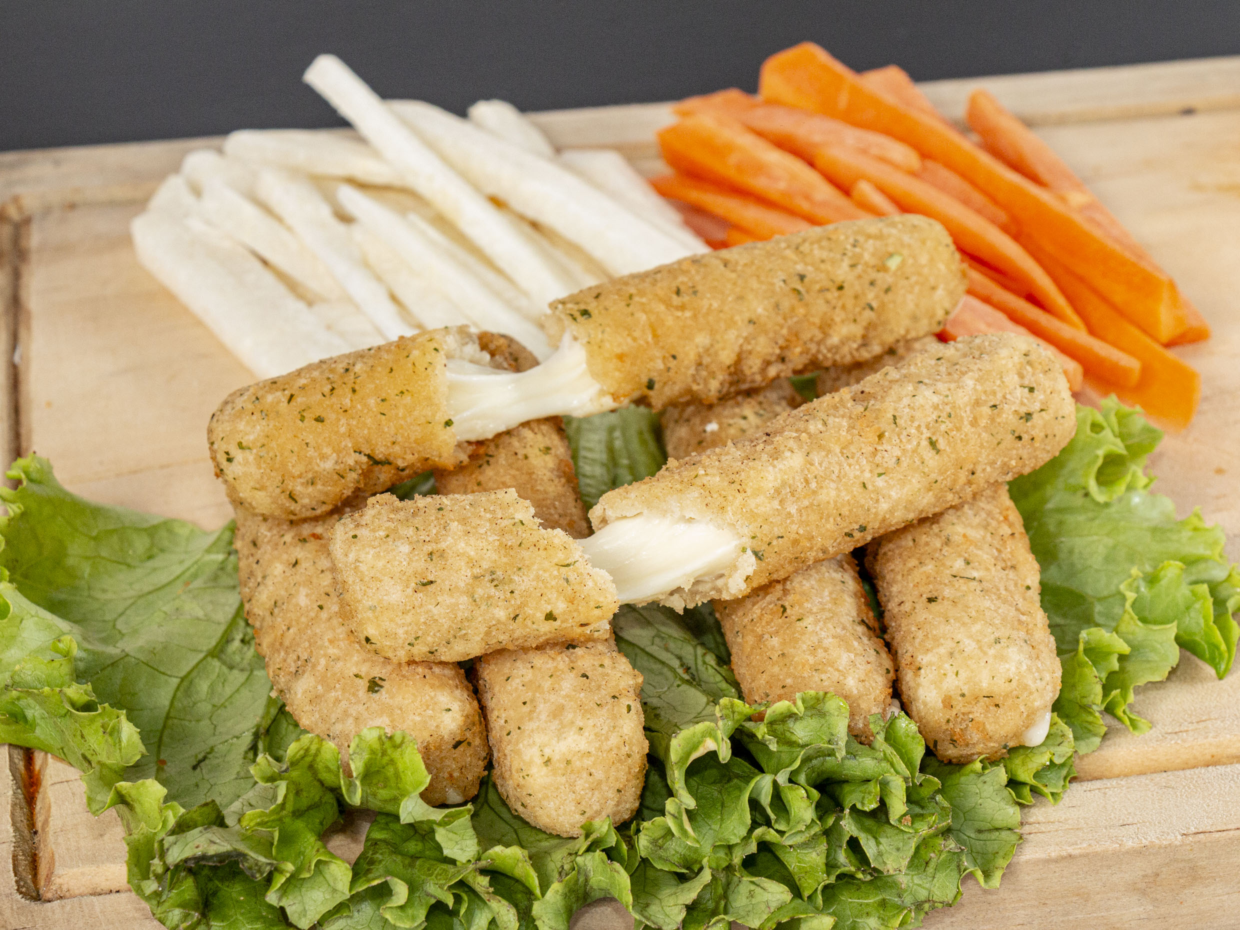 6 deliciosos dedos de queso mozzarella acompañados de su queso amarillo derretido y claro sus bastones de verduras, para chuparse los dedos