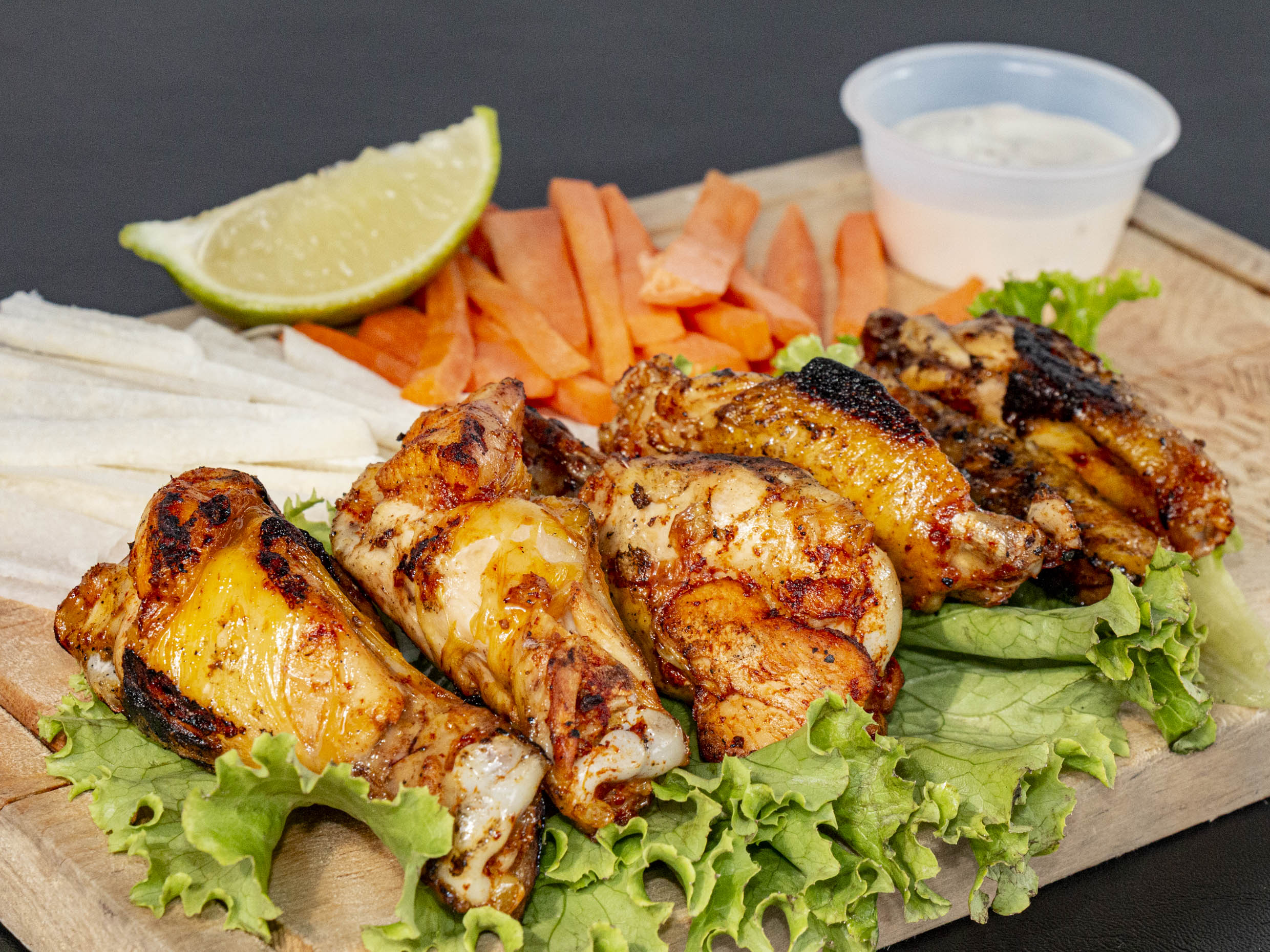 6 piezas de alitas de pollo al carbón con bastones de zanahoria, pepino y aderezo ranch GRATIS.