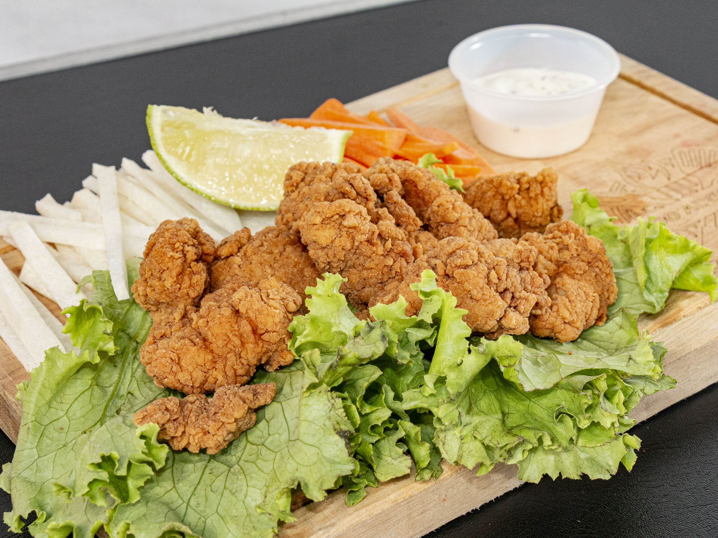 TROSOS DE PECHUGA DE POLLO MARINADA EN UNA EXELENTE CONBINACION DE SABORES, EMPANIZADOS Y BAÑADOS CON LA SALSA DE TU PREFERENCIA . EN VERDAD UNA DELICIA