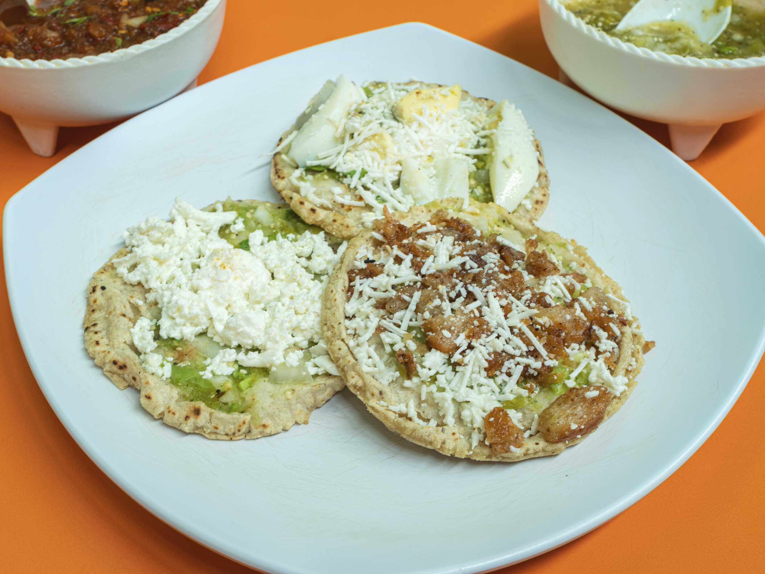 3 piezas de sopes elige tu sabor, 1 queso, 1 huevo y 1 Tierritas. Tamaño chico.