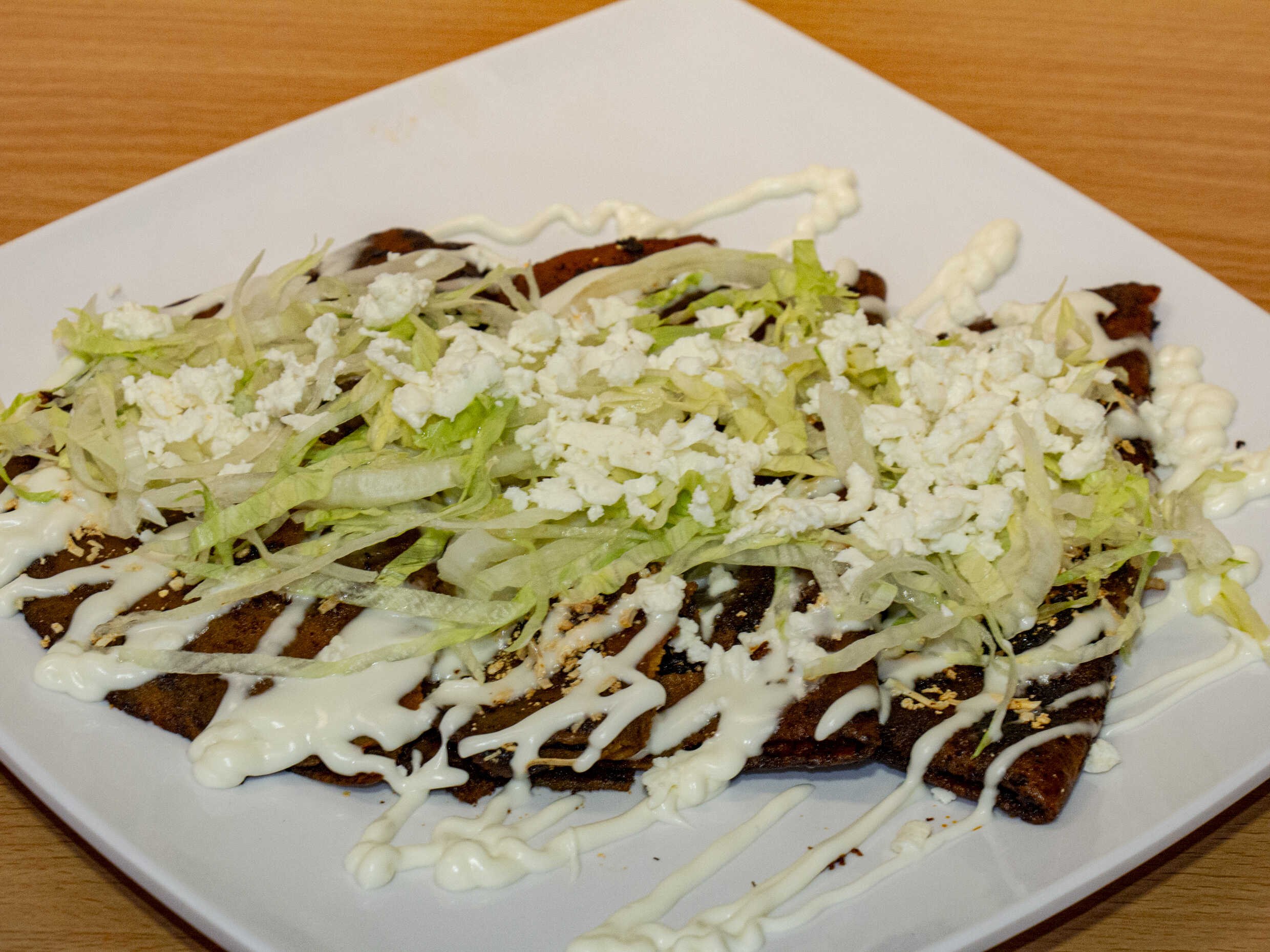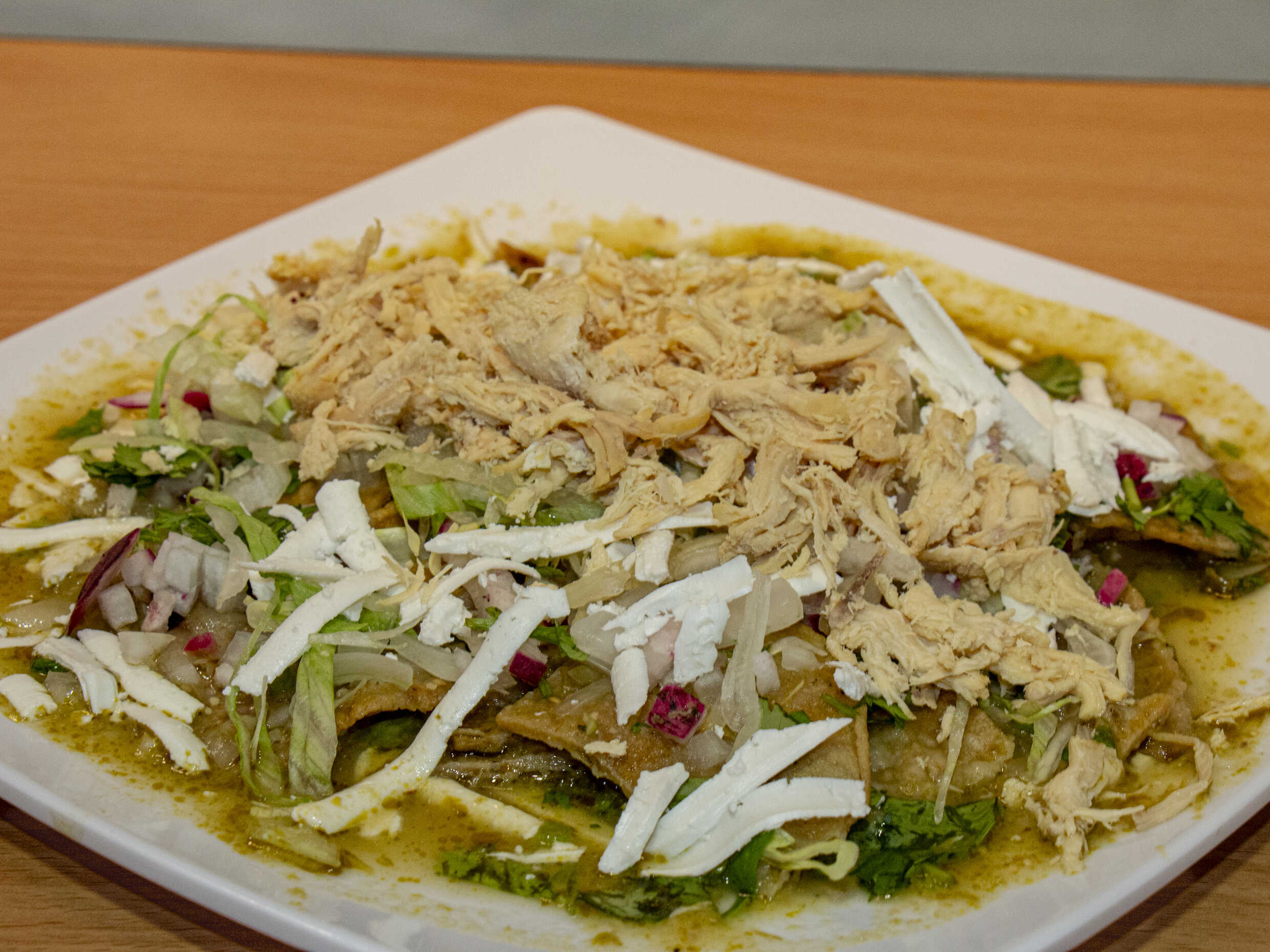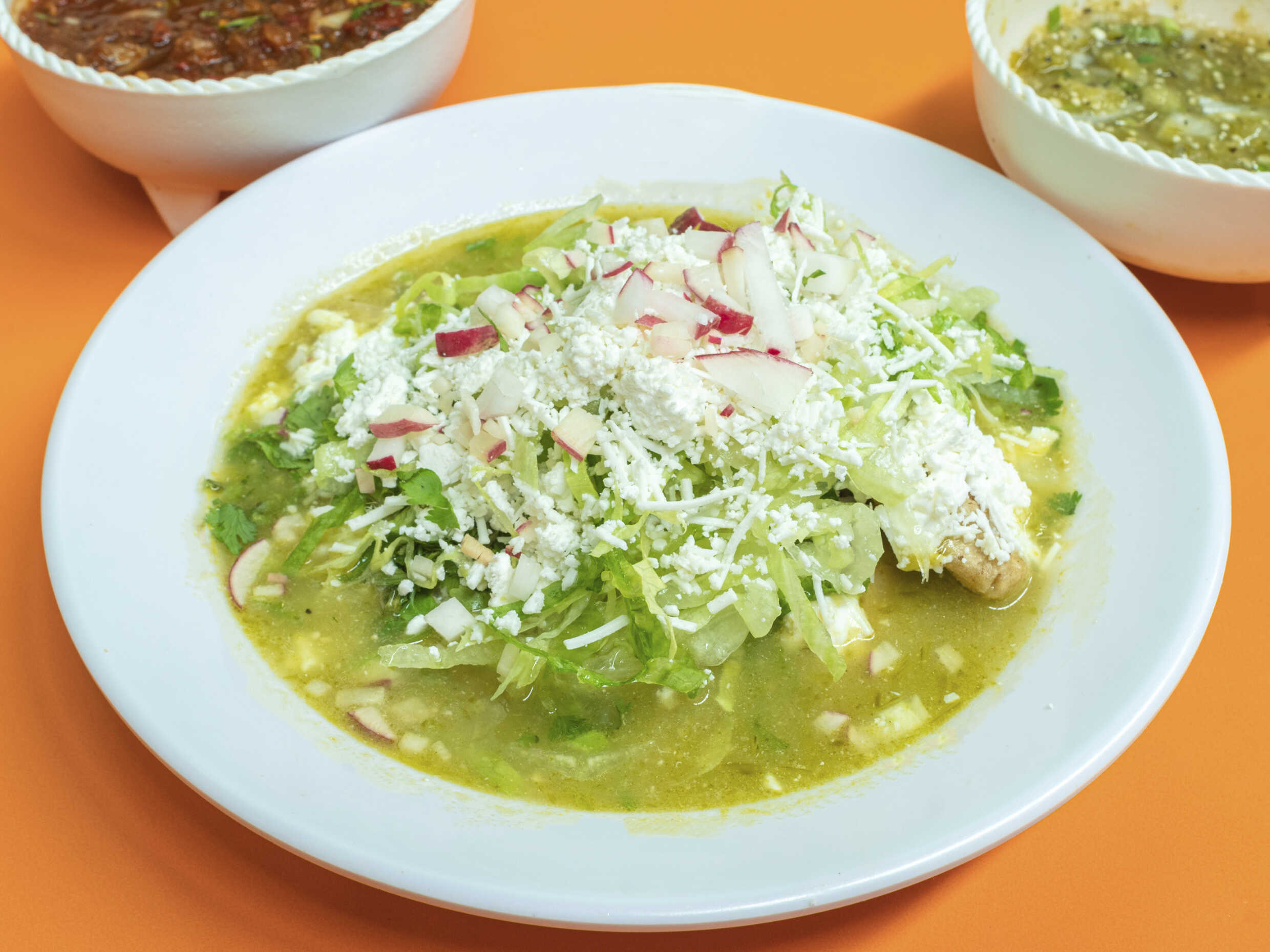 En salsa verde, acompañadas con pollo o huevo, queso, crema, lechuga, cilantro, rábano, cebolla