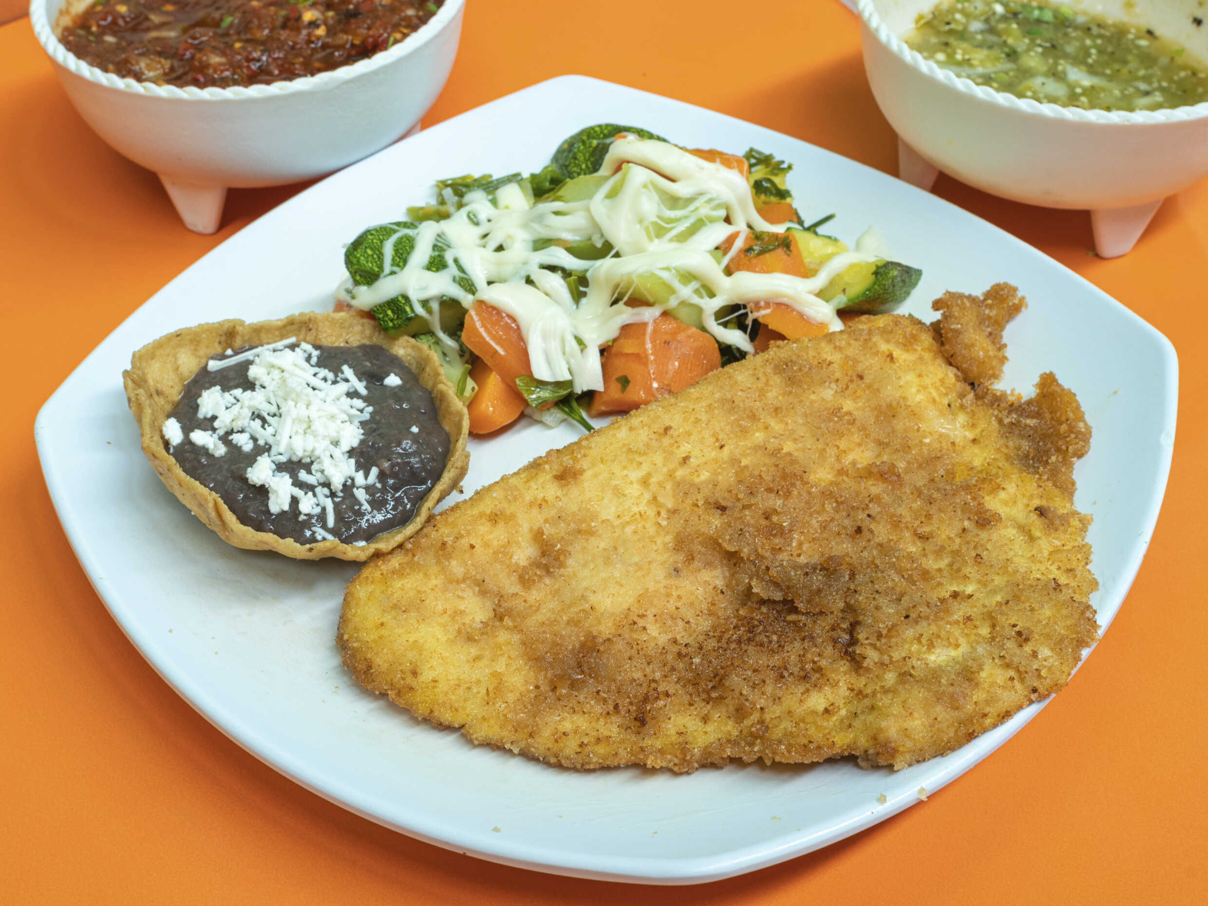 Ensalada del dia y frijoles refritos