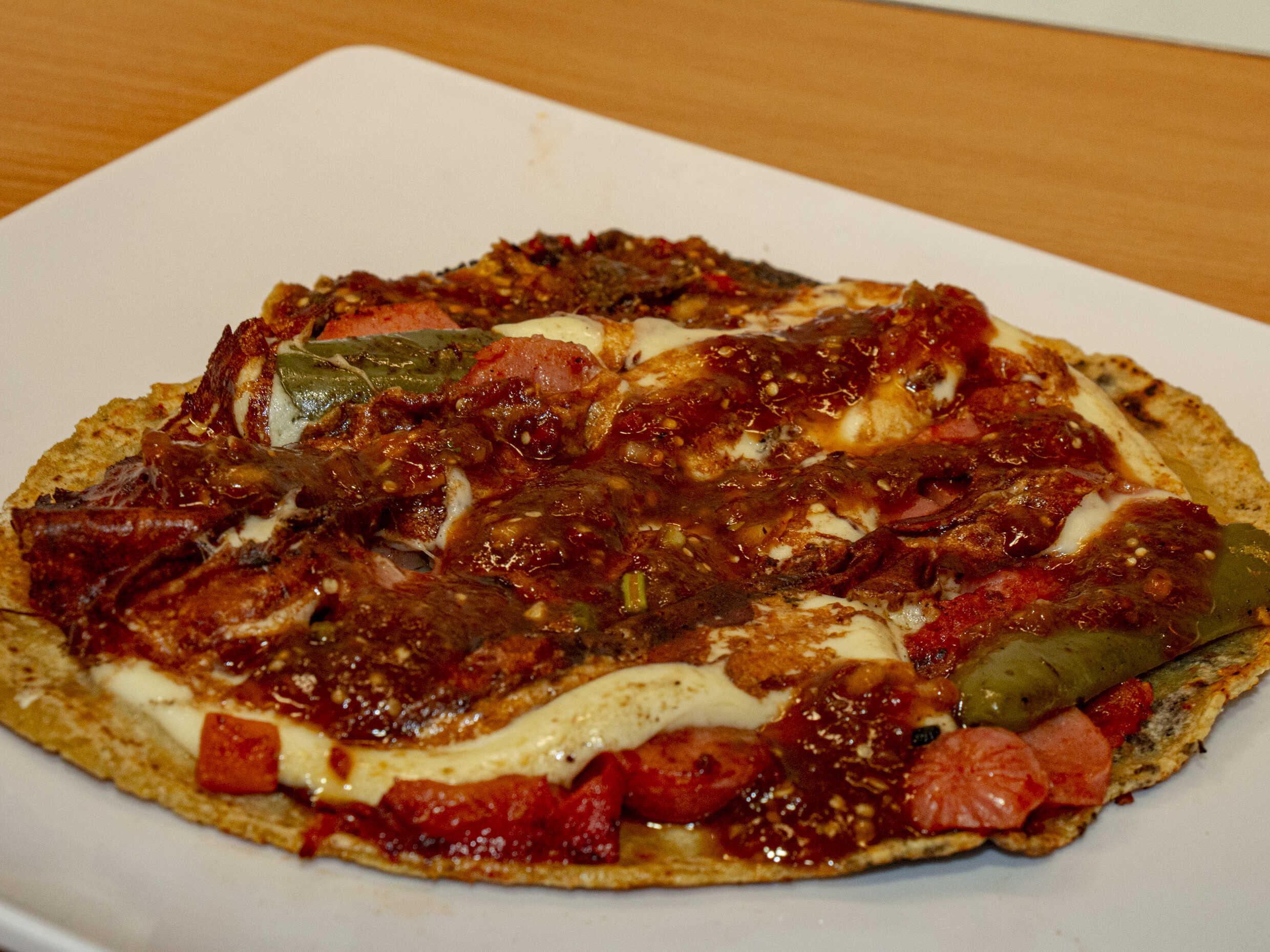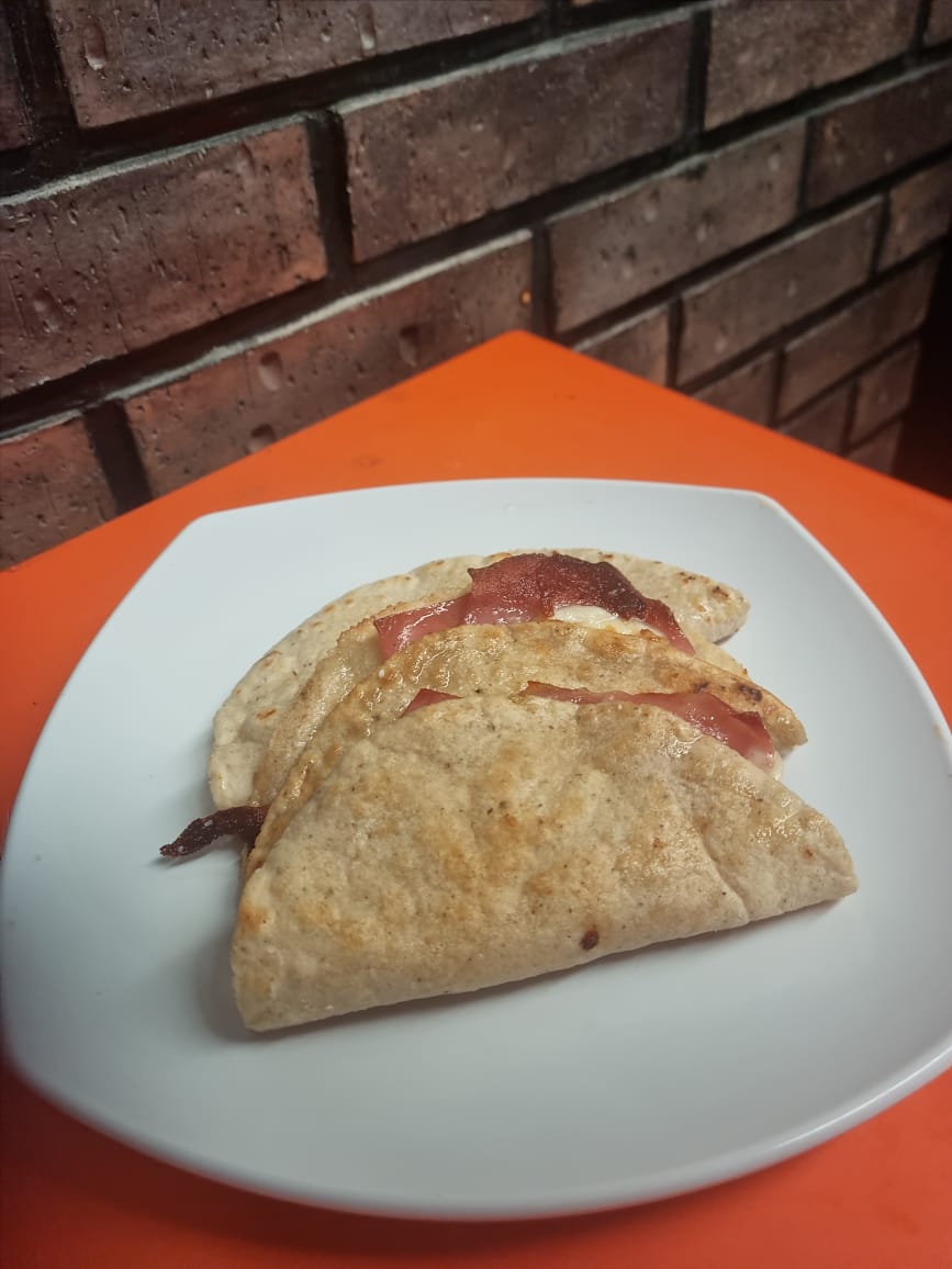Con quesillo, jamón y queso amarillo, acompañada de ensalada del día y frijoles refritos