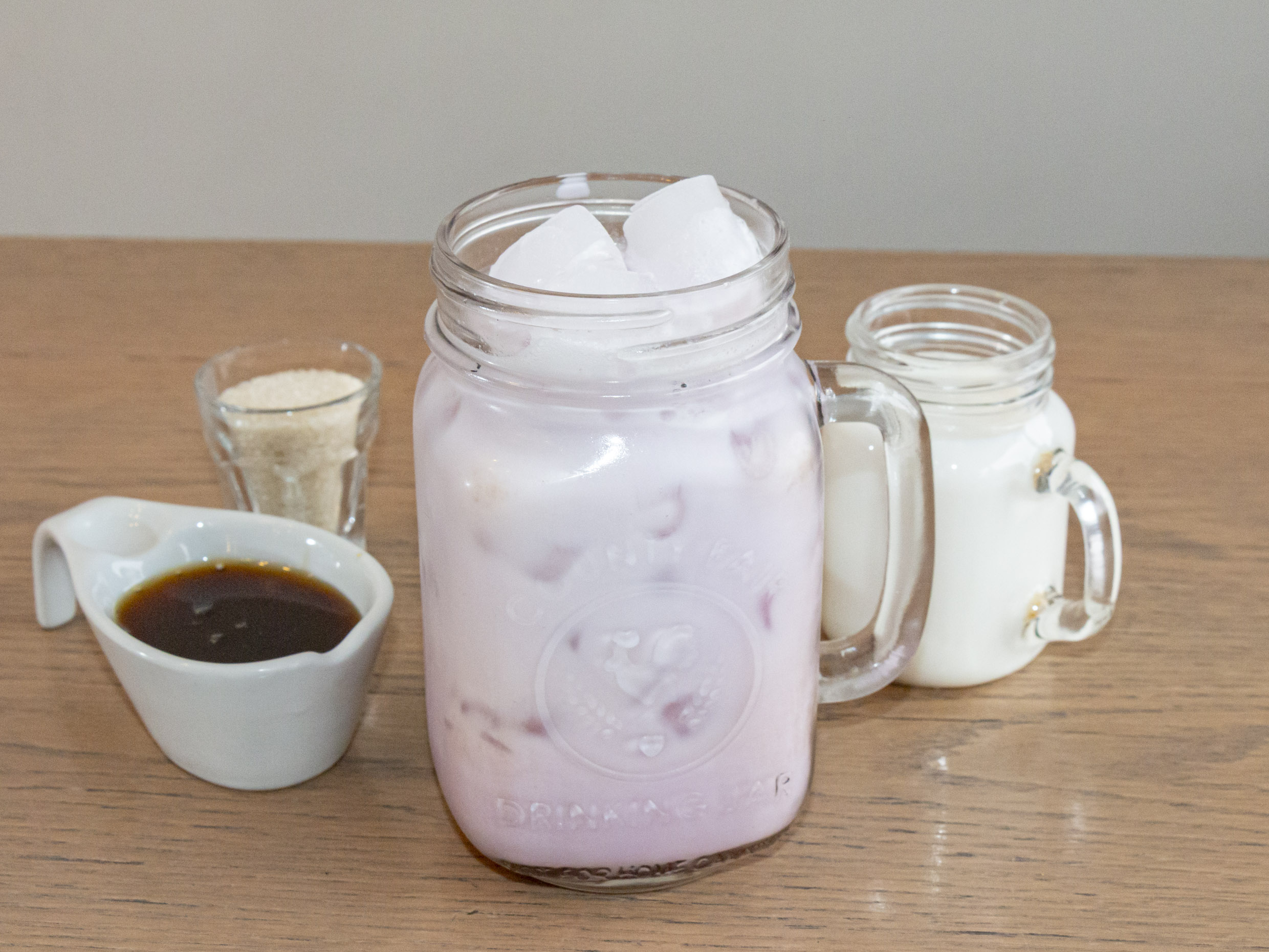Latte a base de ube puro (camote morado) en polvo con leche y endulzante a elegir.